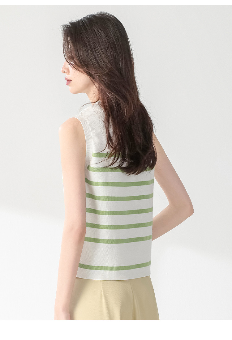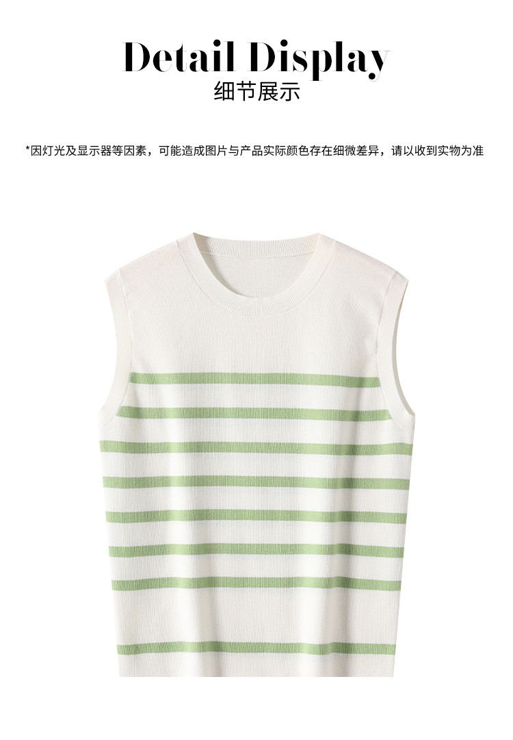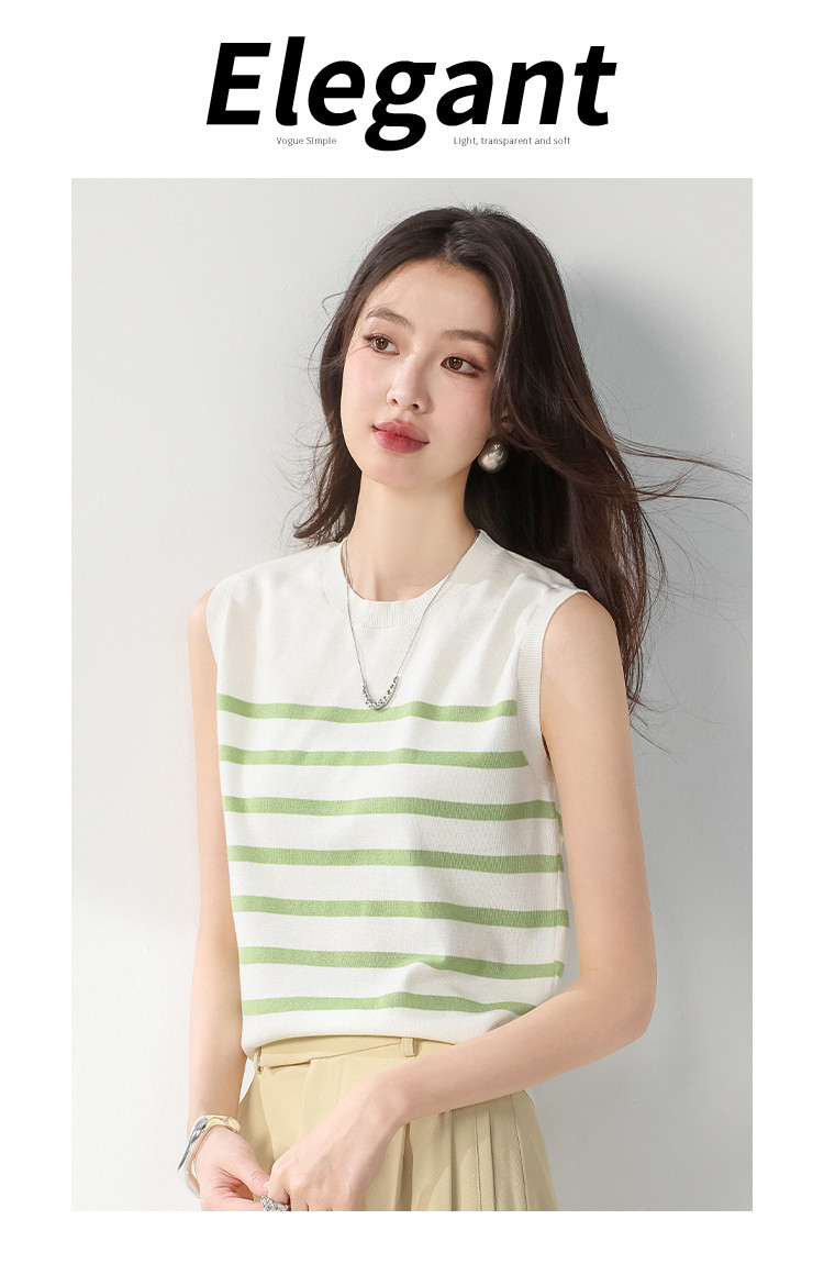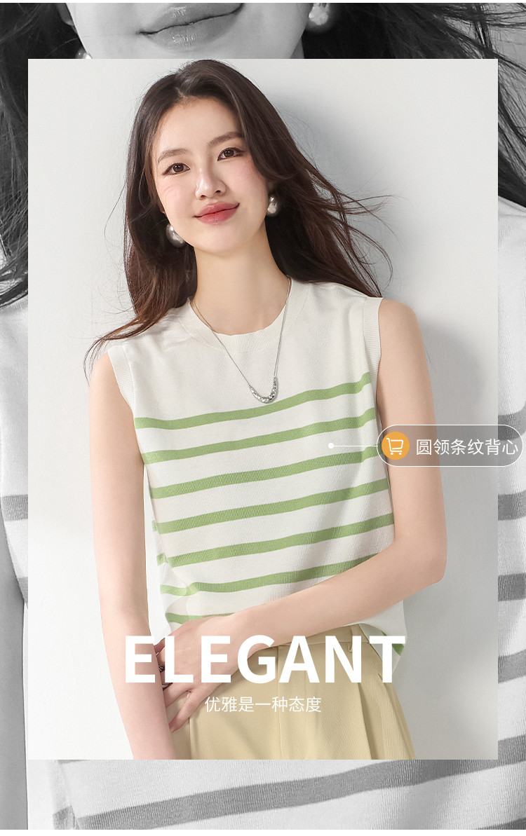 商品名称:圆领经典条纹含桑蚕丝无袖薄款针织衫女背心马甲春夏T恤上衣 163155