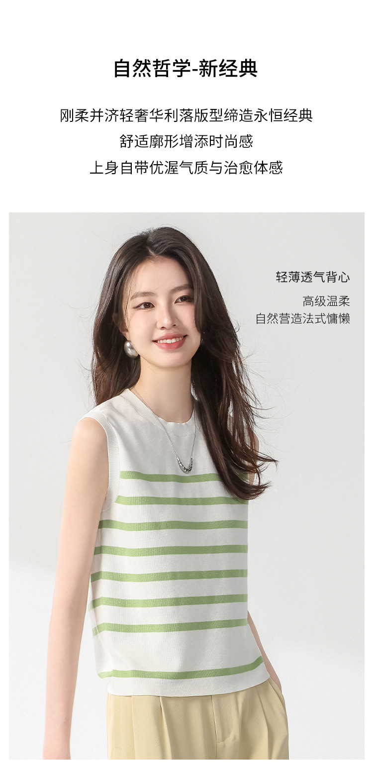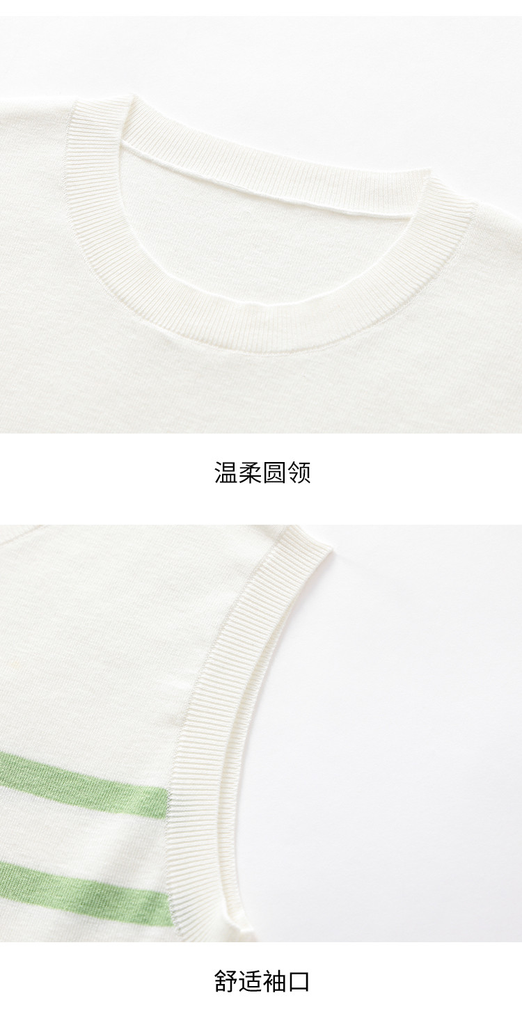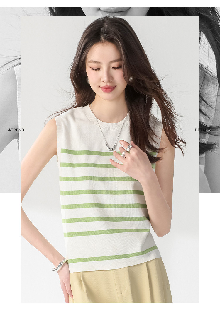 商品名称:圆领经典条纹含桑蚕丝无袖薄款针织衫女背心马甲春夏T恤上衣 163155