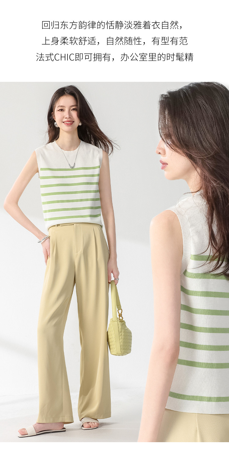 圆领经典条纹含桑蚕丝无袖薄款针织衫女背心马甲春夏T恤上衣 163155