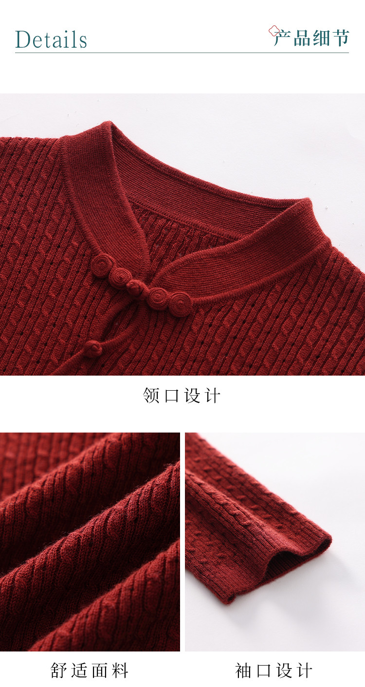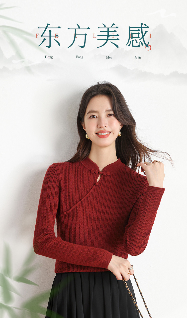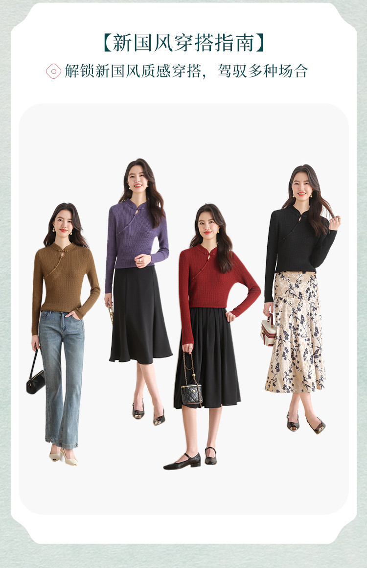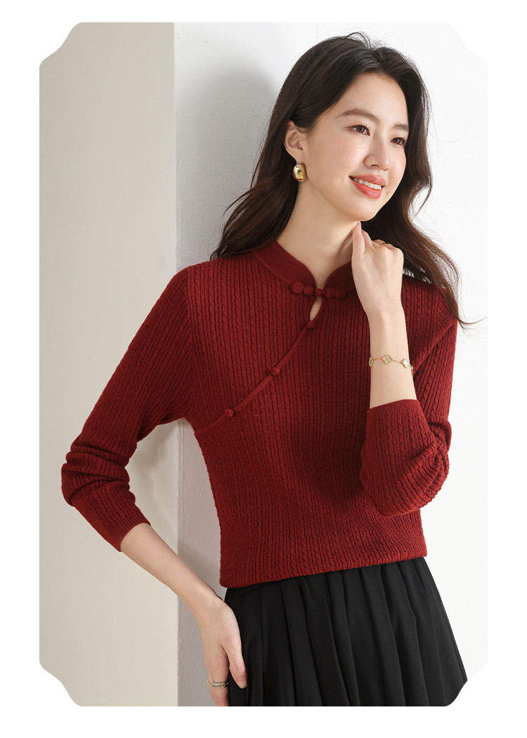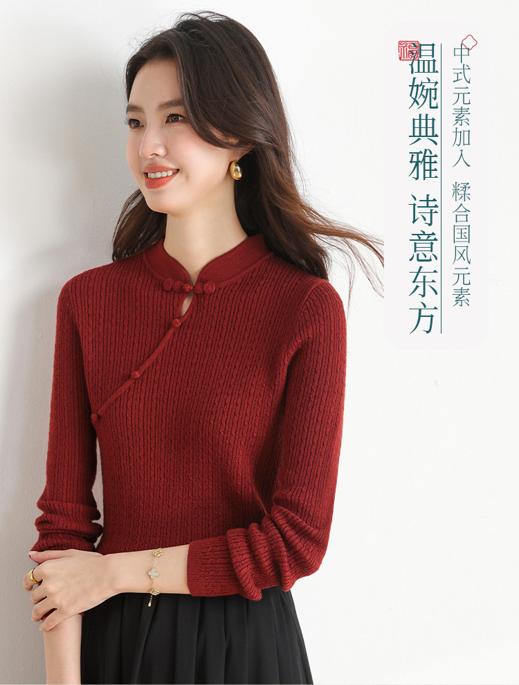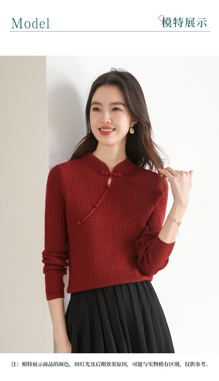 商品名称:【新中式】旗袍领盘扣针织衫女套头纯色绞花时尚羊毛打底衫线衫春 296467