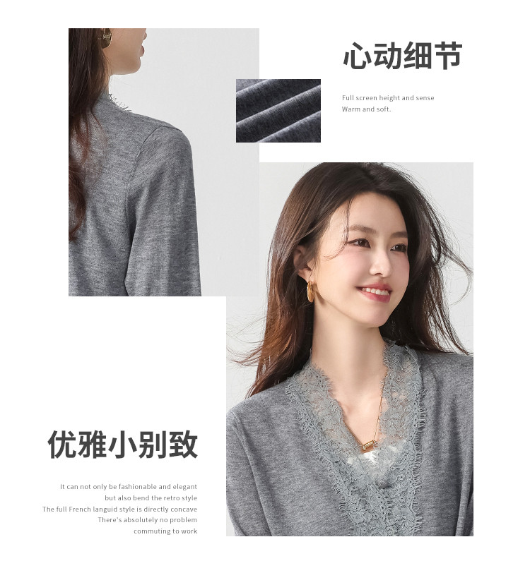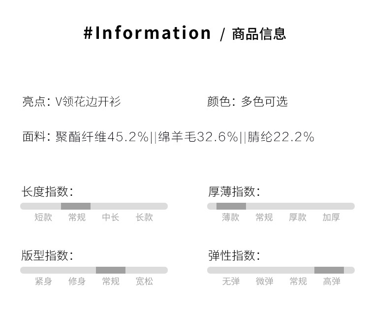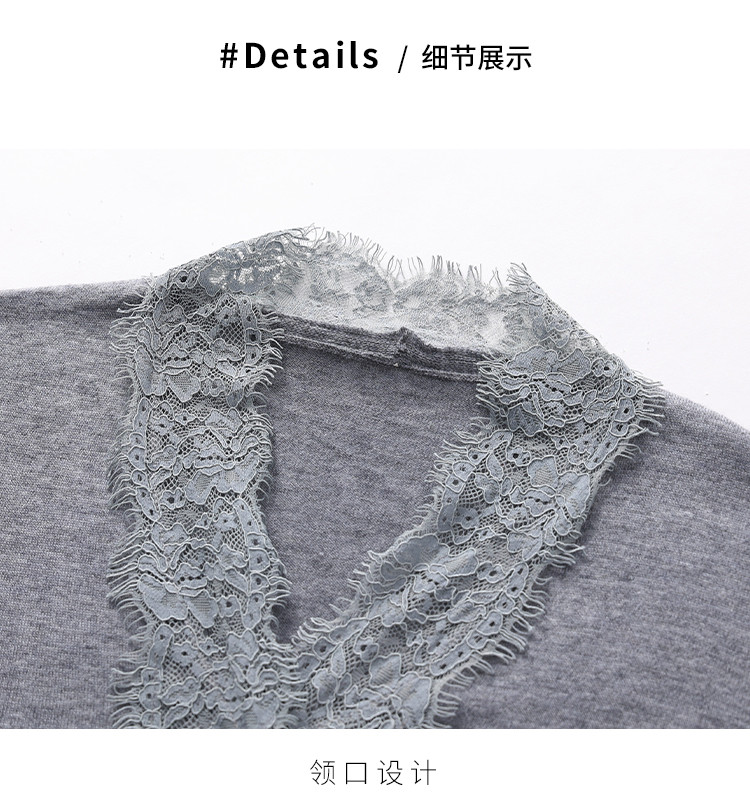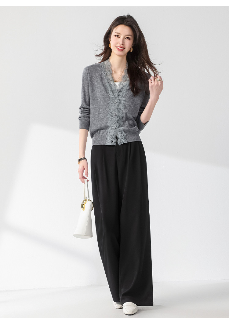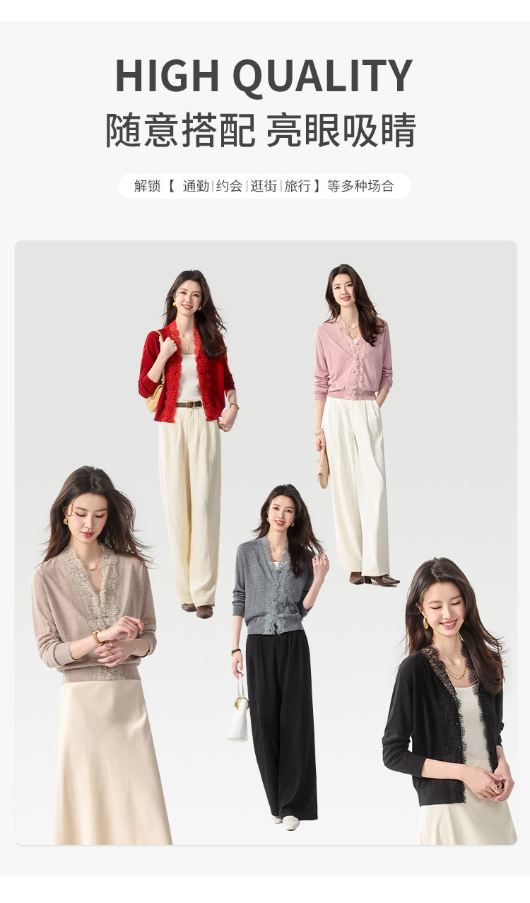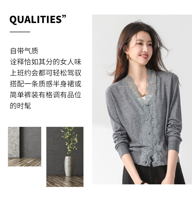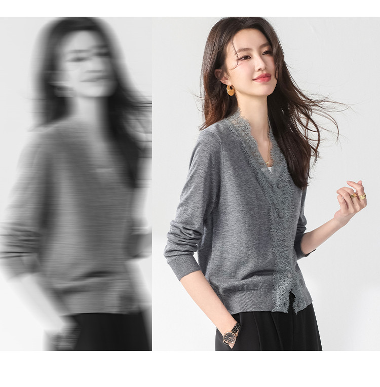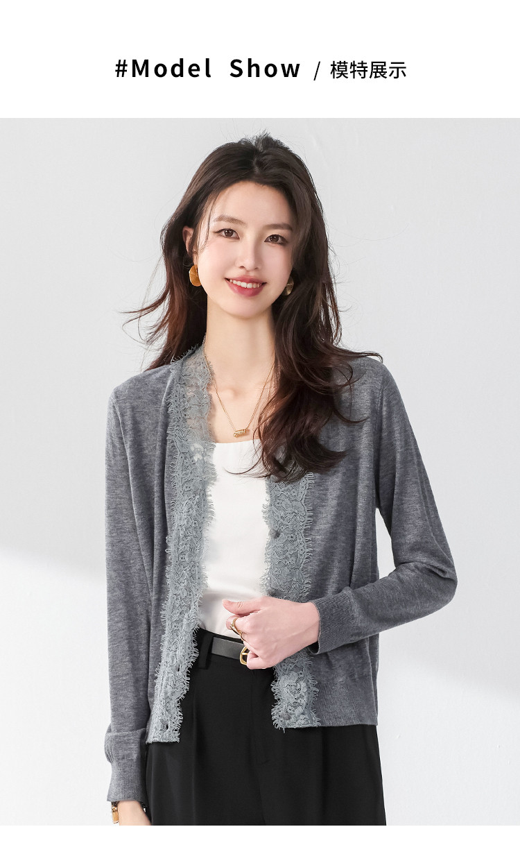 商品名称:V领蕾丝边纯色羊毛开衫纽扣针织衫女开衫春夏薄款气质毛衣外套 526099