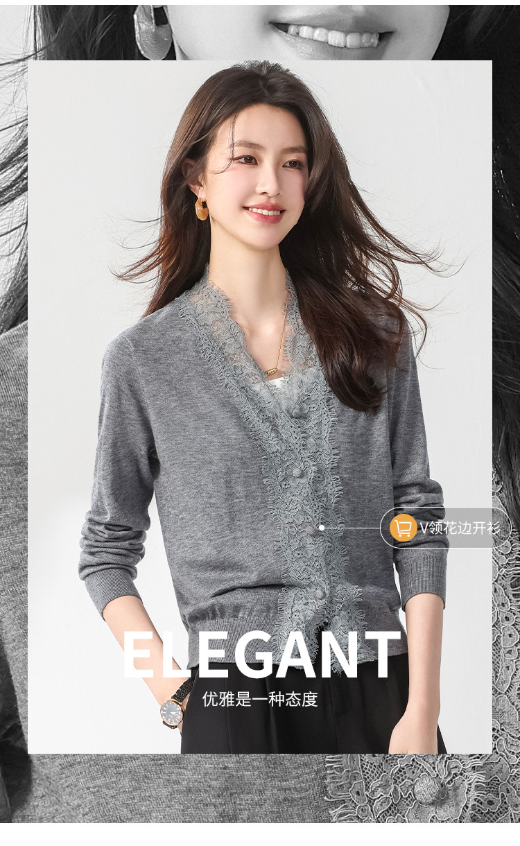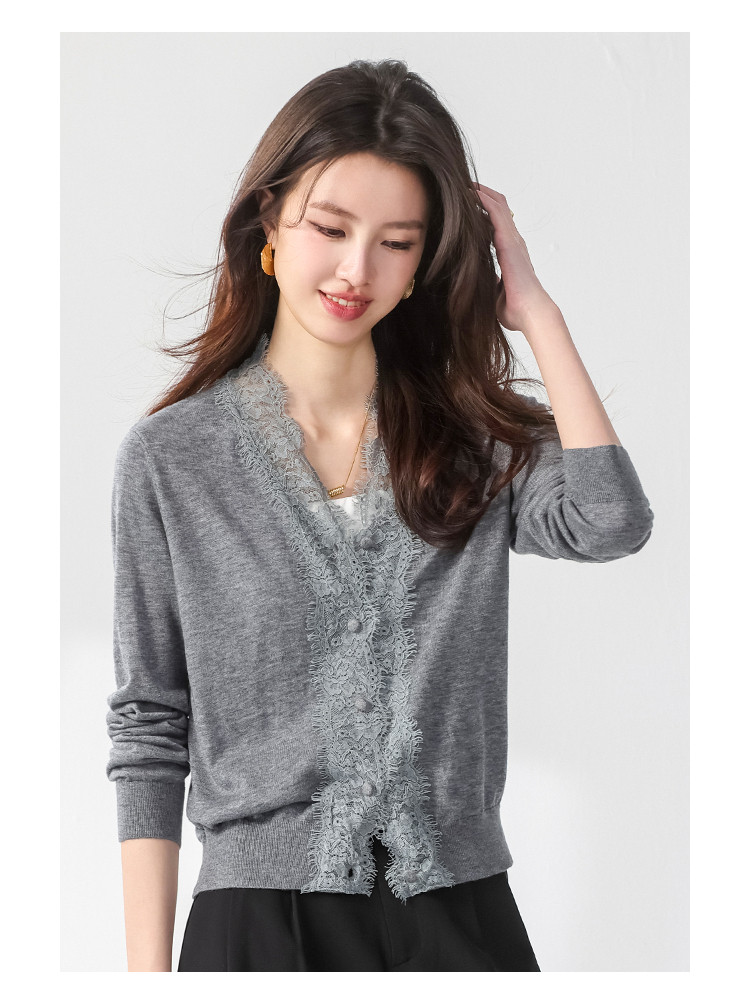 V领蕾丝边纯色羊毛开衫纽扣针织衫女开衫春夏薄款气质毛衣外套 526099