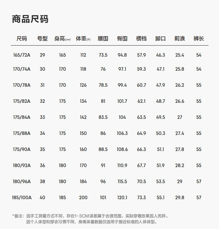| 尺码 | 腰围(cm) | 裤长(cm) | 前浪(cm) | 臀围(cm) | 号型 |