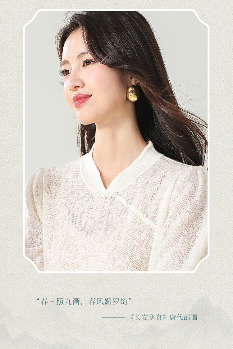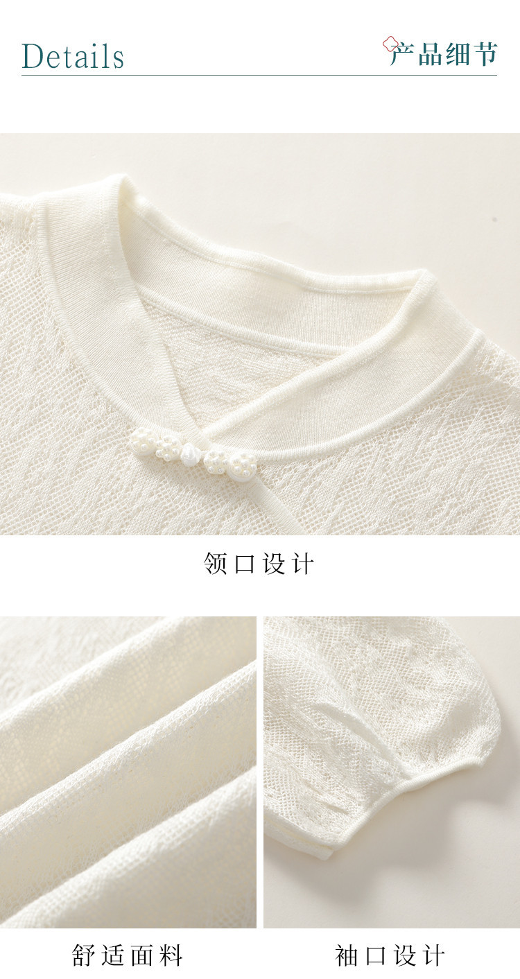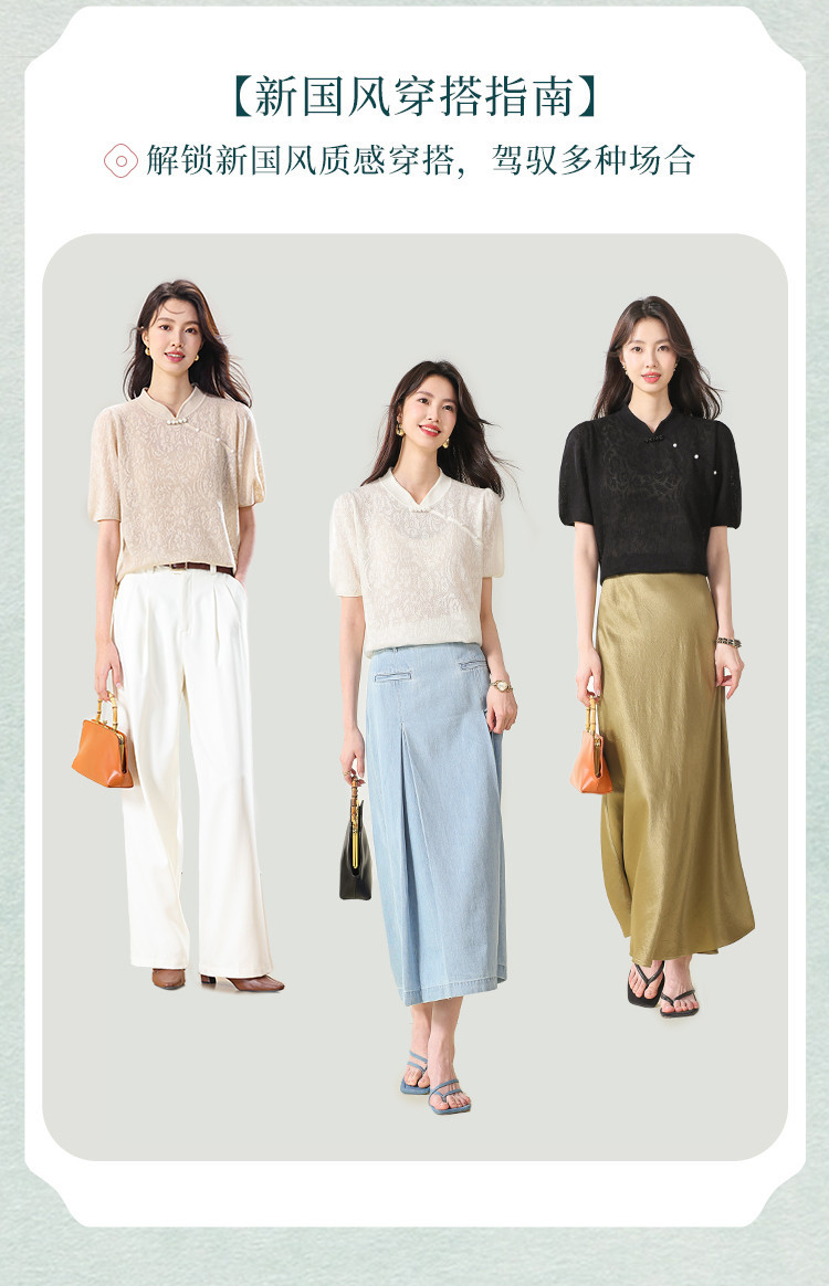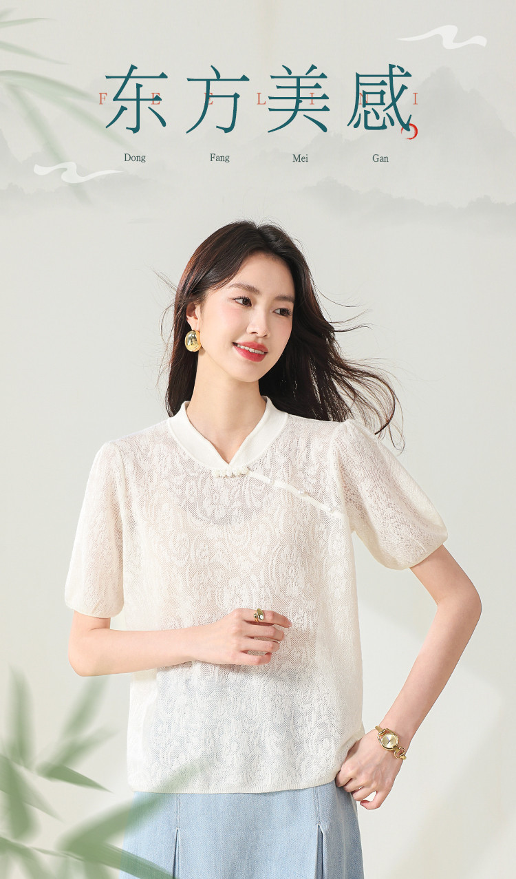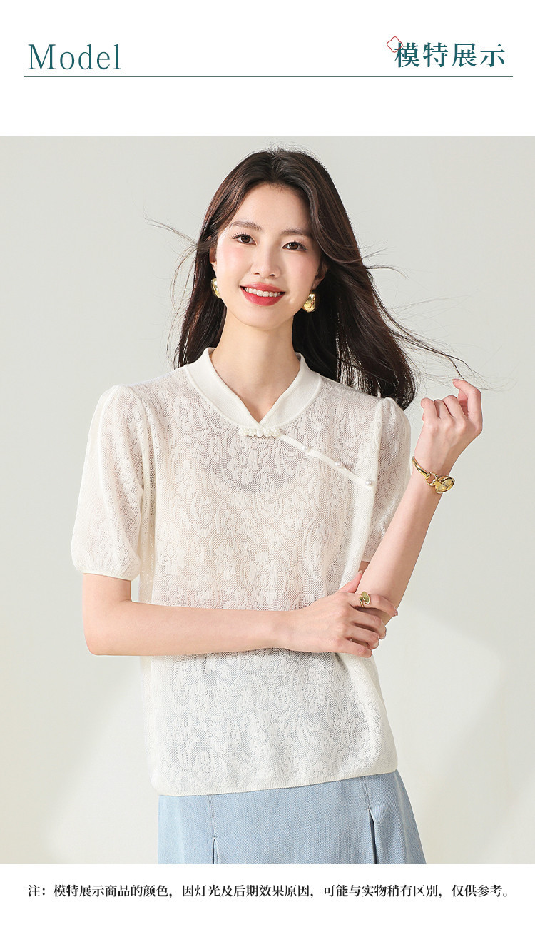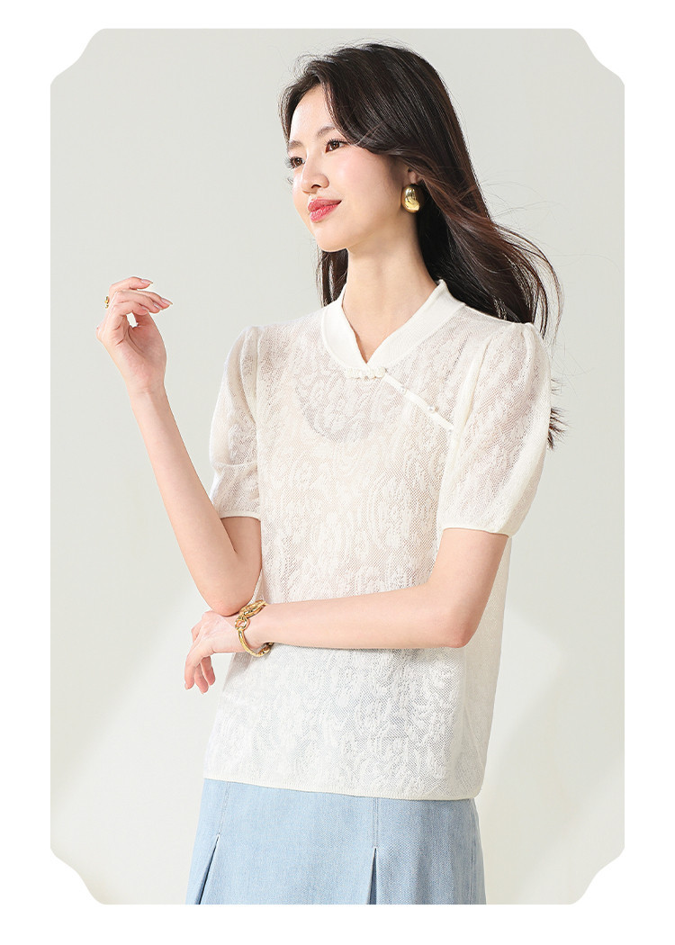 商品名称:【国风】新中式旗袍领精美提花含绵羊毛针织打底短袖T恤 327379