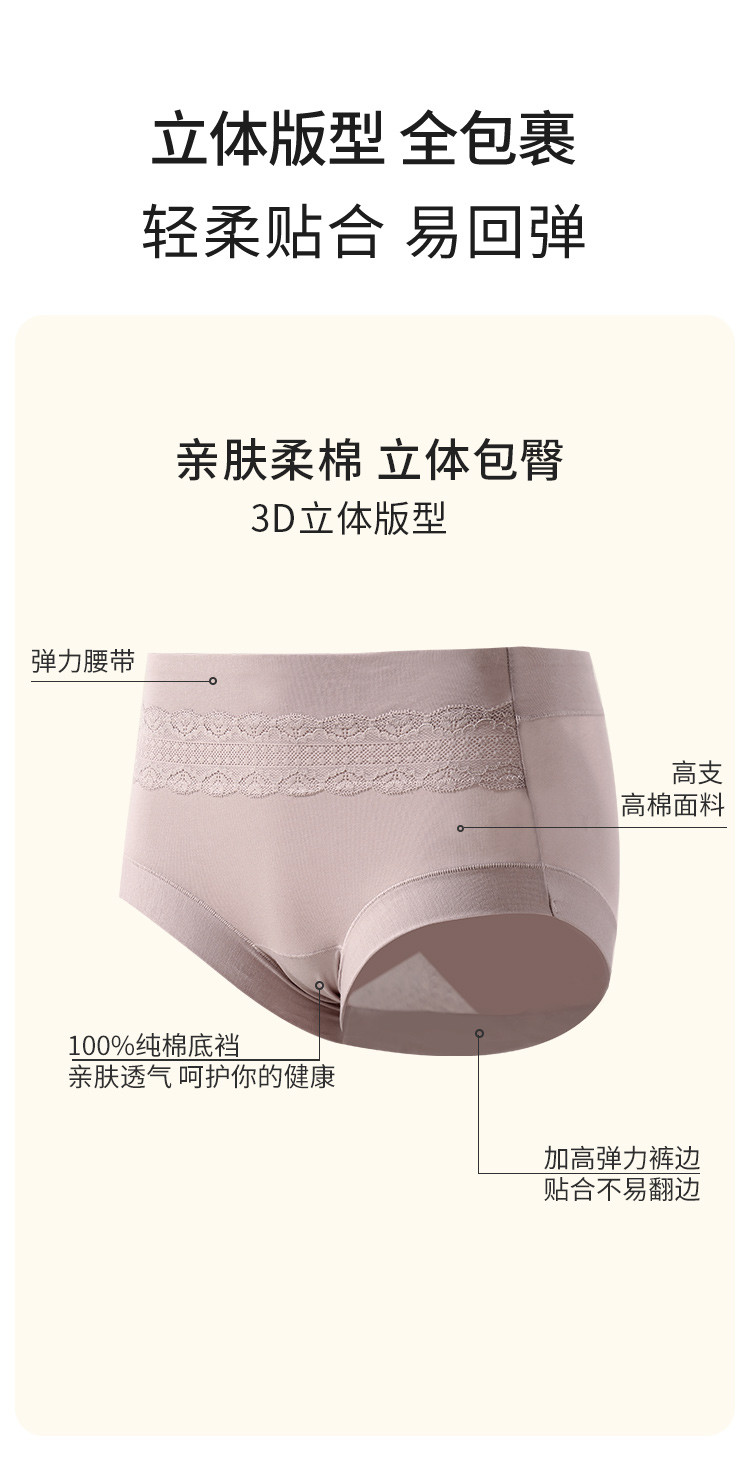 【7A抑菌立体包臀】纯棉底档蕾丝中高腰收腹提臀女士内裤3条装 005854