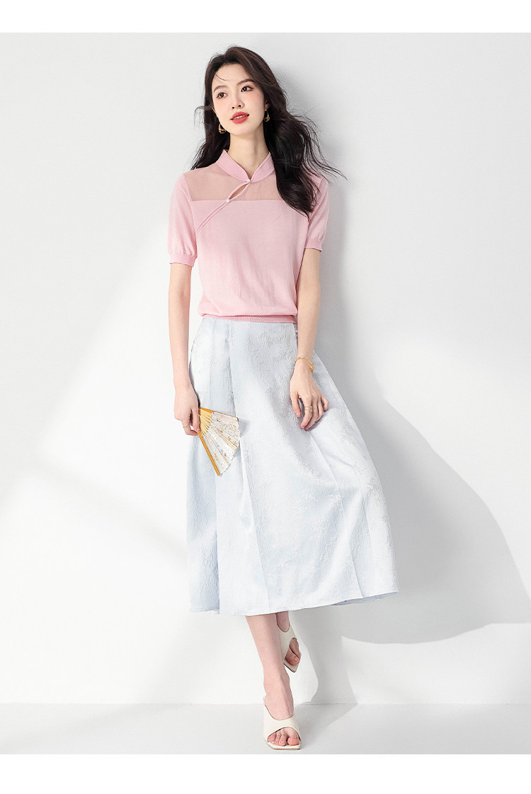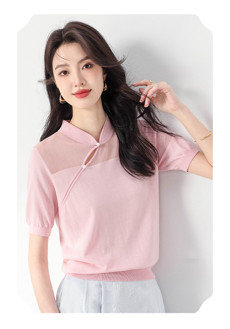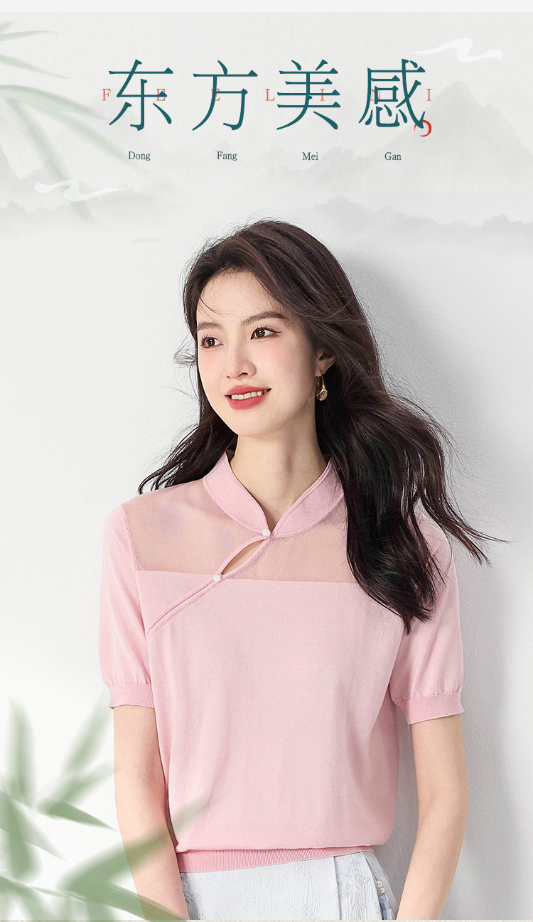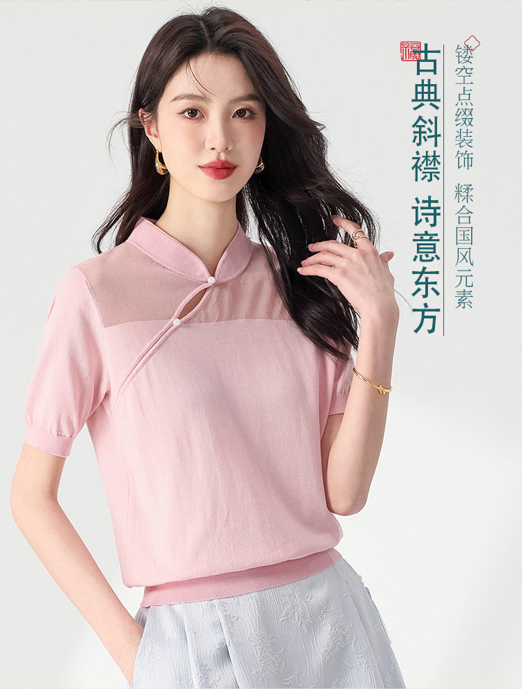 【国风】新中式旗袍立领含桑蚕丝纯色针织打底衫短袖T恤女 772243