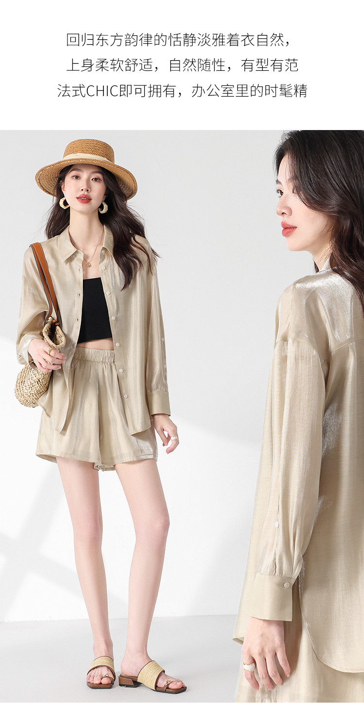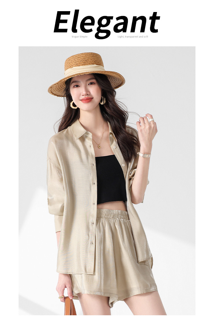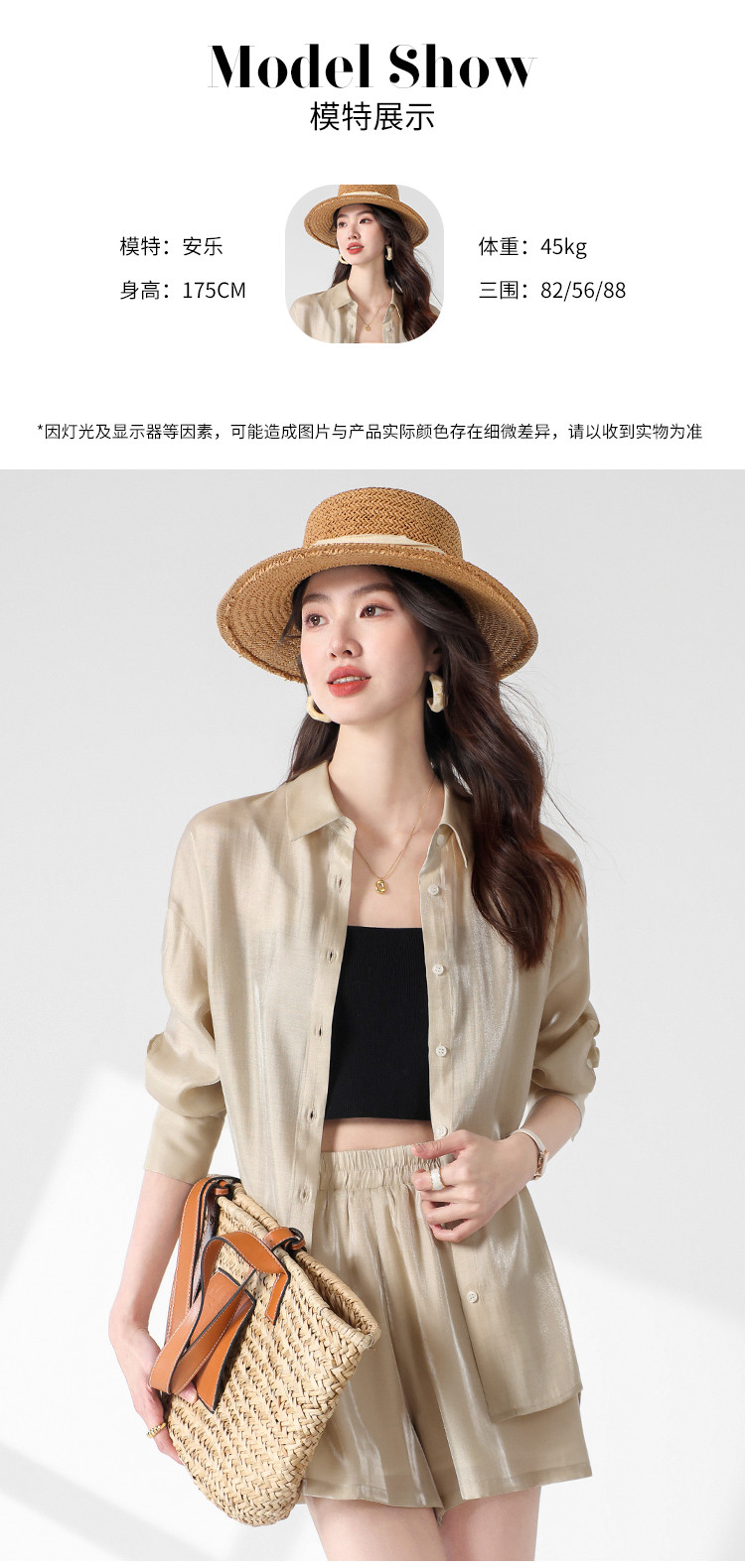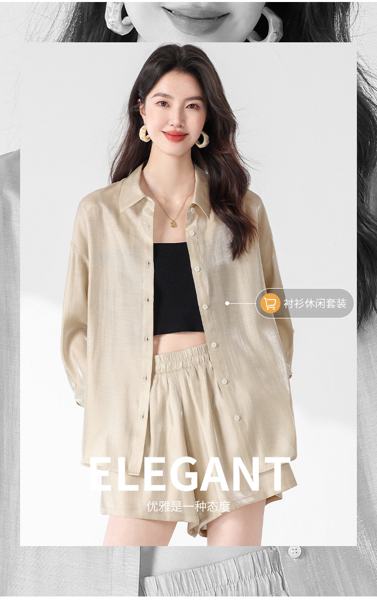 【两件套】纯色休闲衬衫松紧腰纯色短裤夏季薄款两件套套装 388307