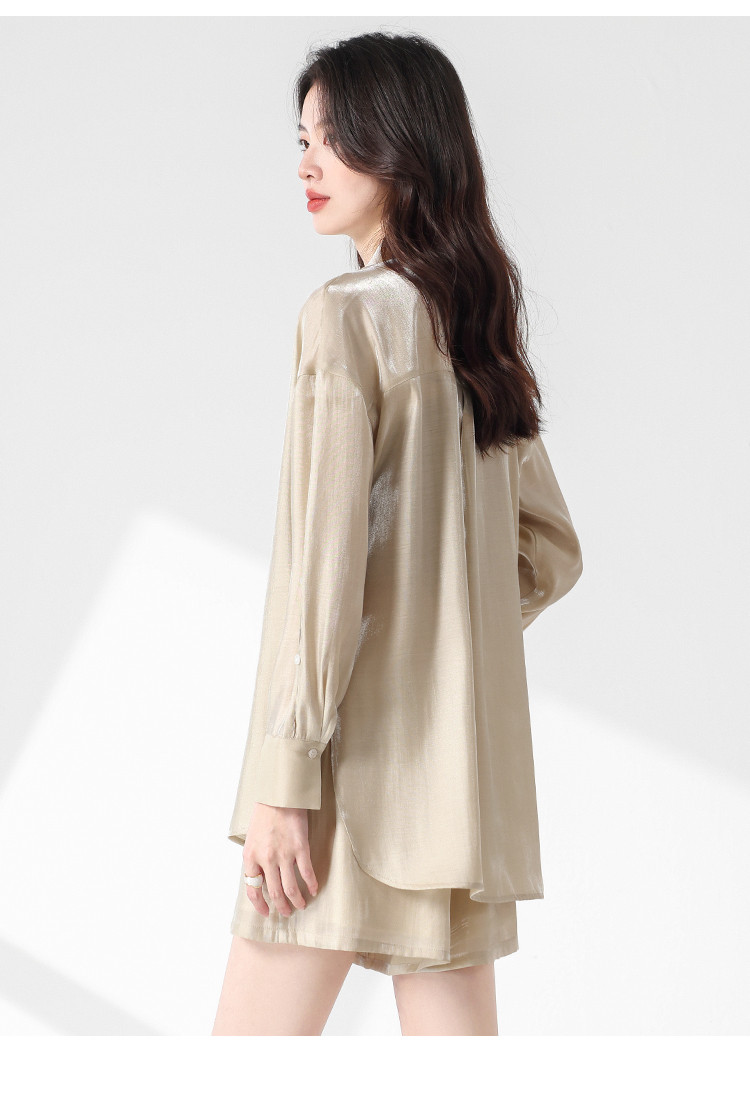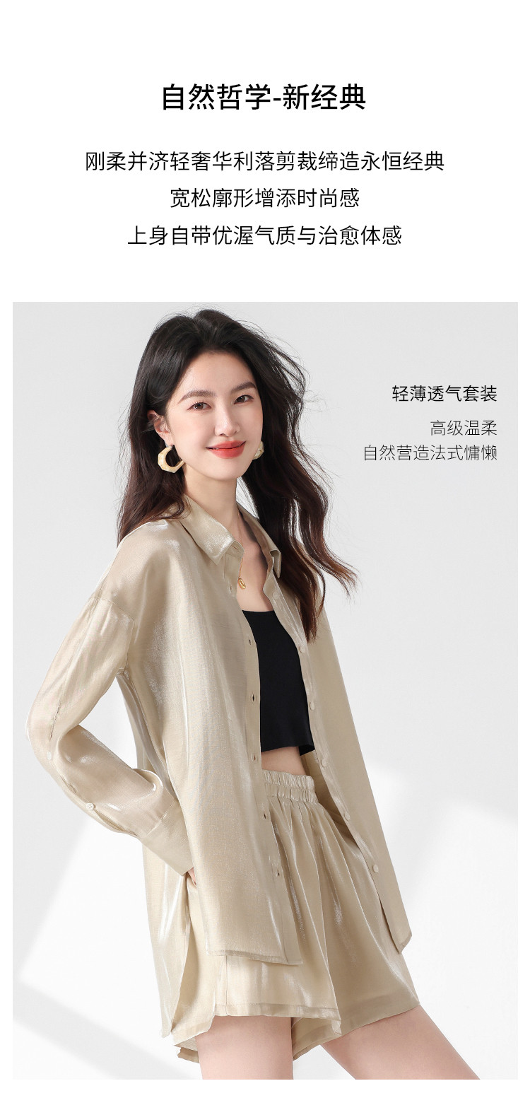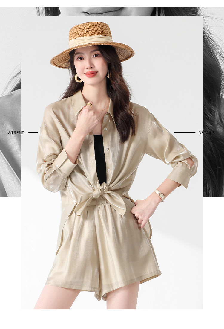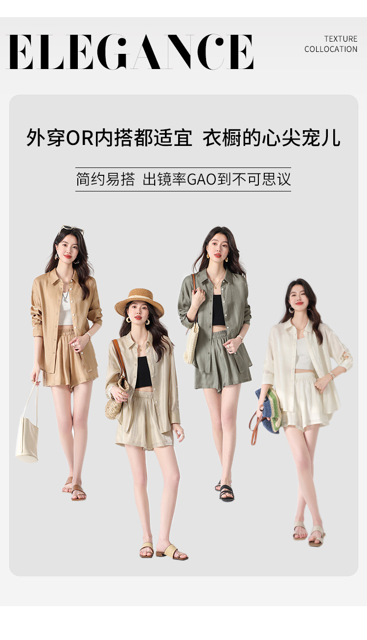 【两件套】纯色休闲衬衫松紧腰纯色短裤夏季薄款两件套套装 388307