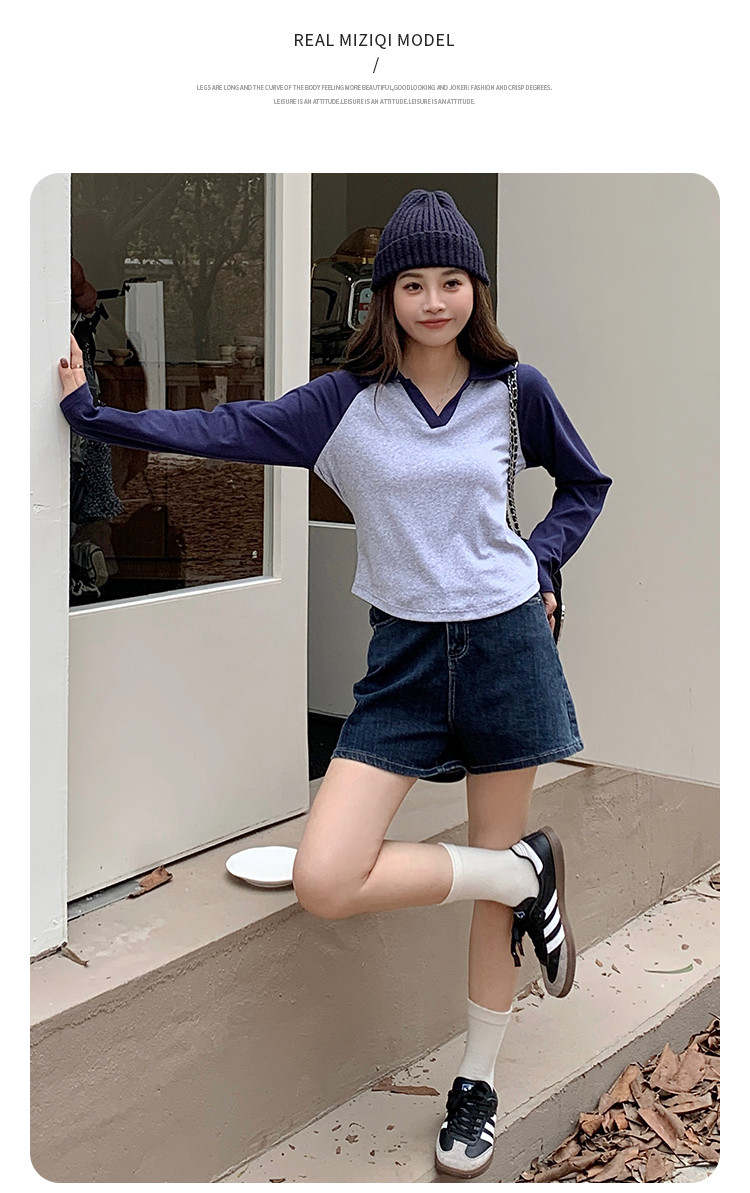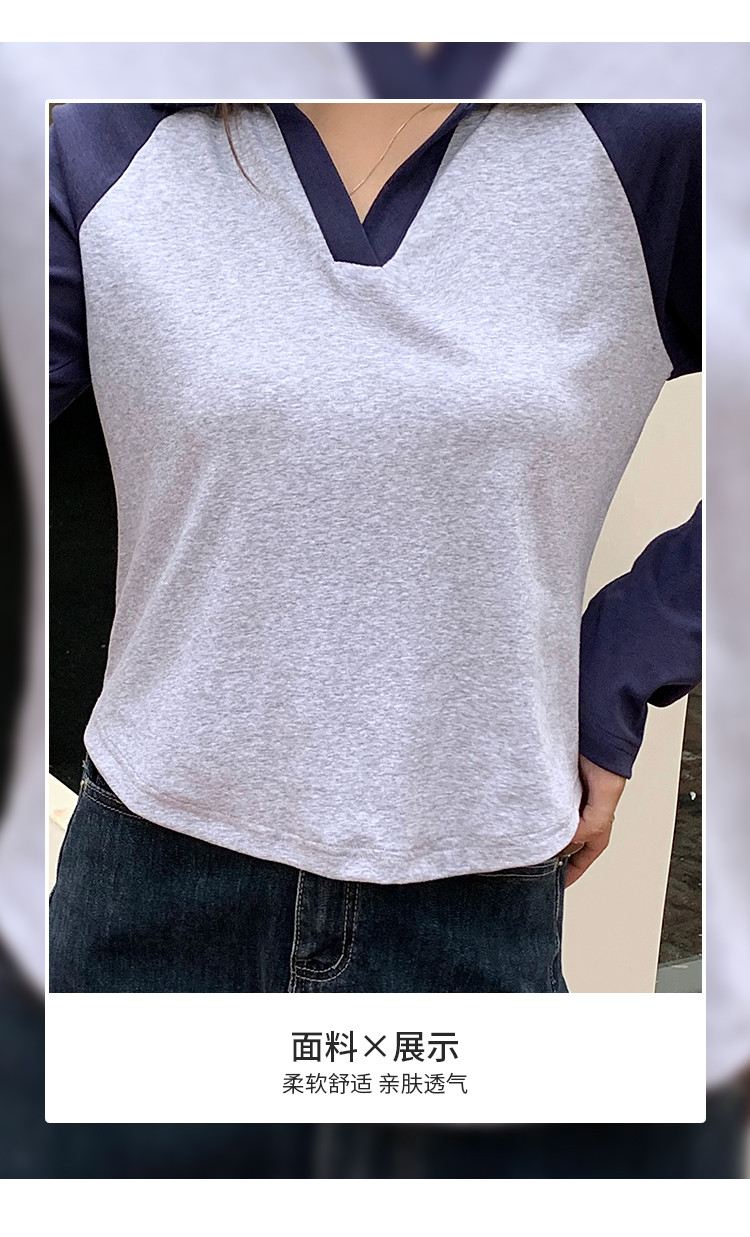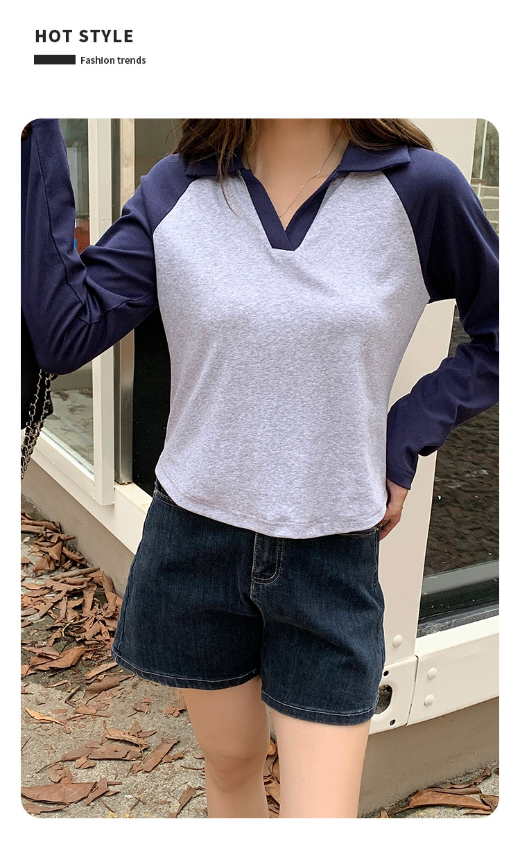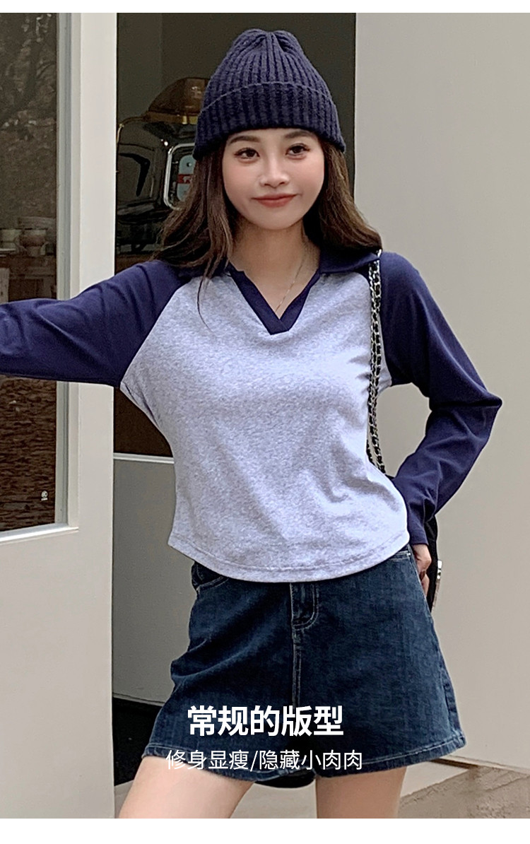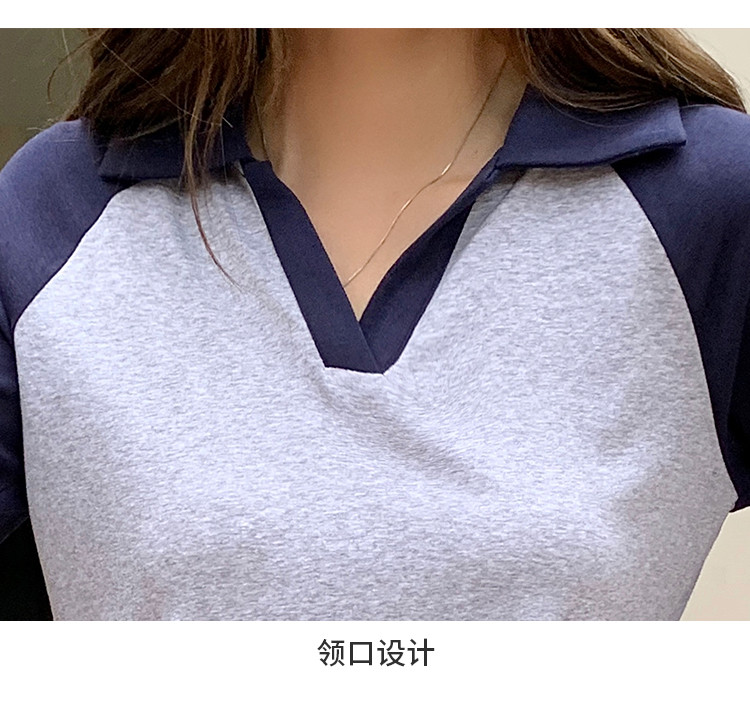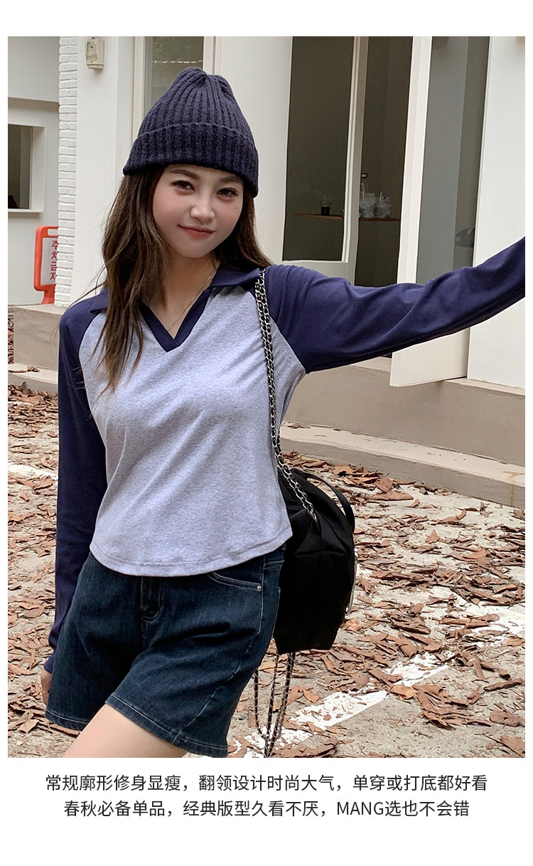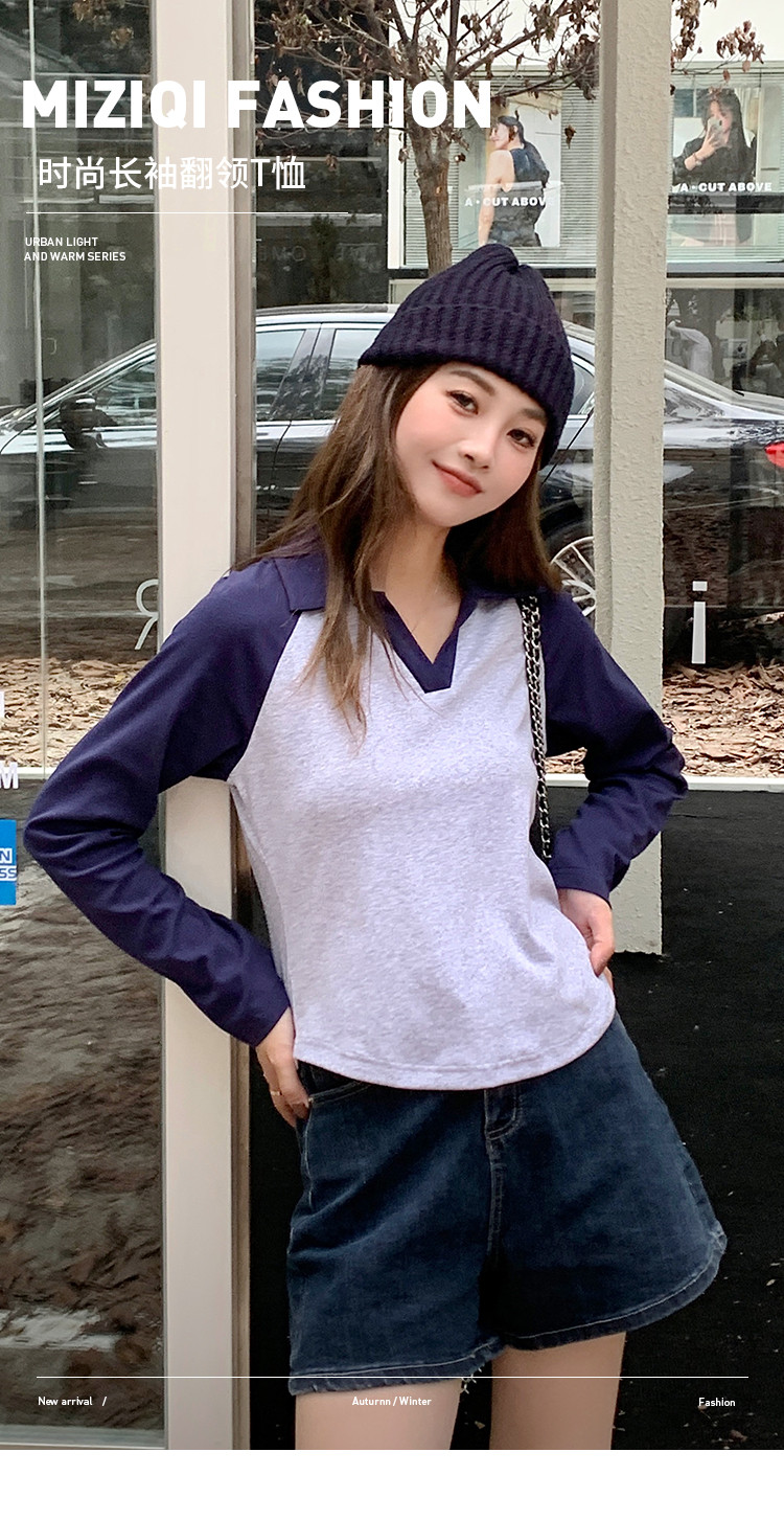 商品名称:米子旗春秋款polo领女式T恤撞色袖设计减龄长袖上衣 990234