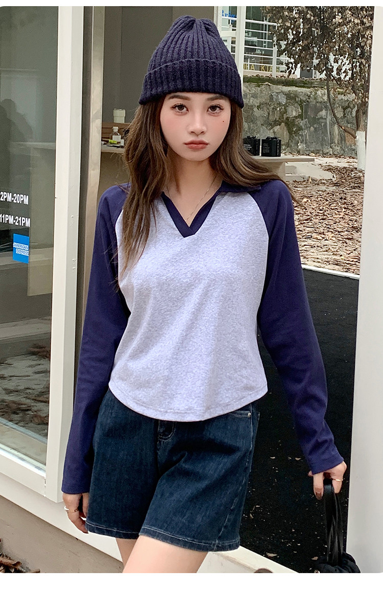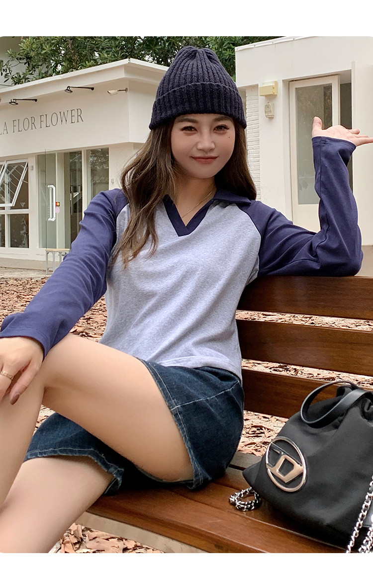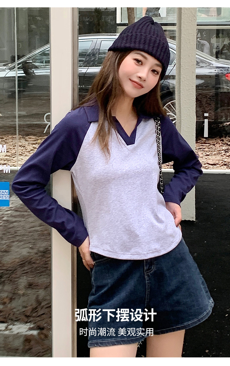 米子旗春秋款polo领女式T恤撞色袖设计减龄长袖上衣 990234