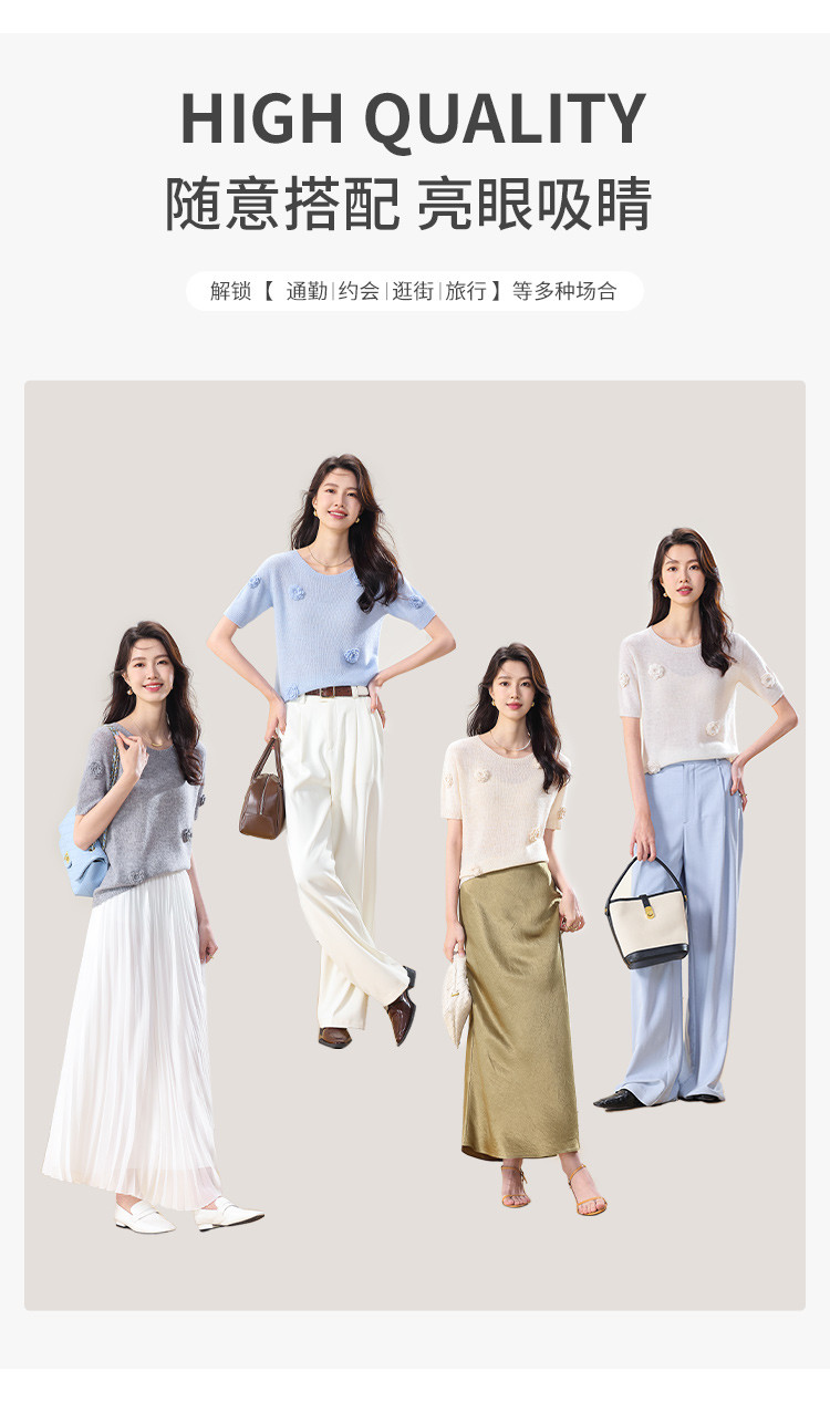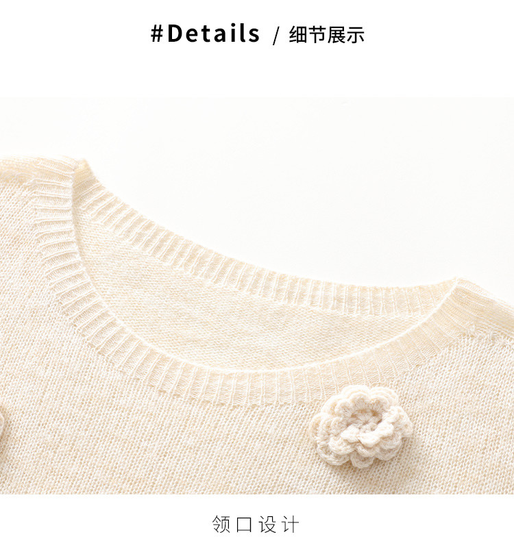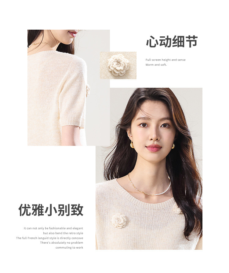 商品名称:圆领纯色针织衫女春装上衣立体花朵短袖羊毛衫高级感女式T恤 210067