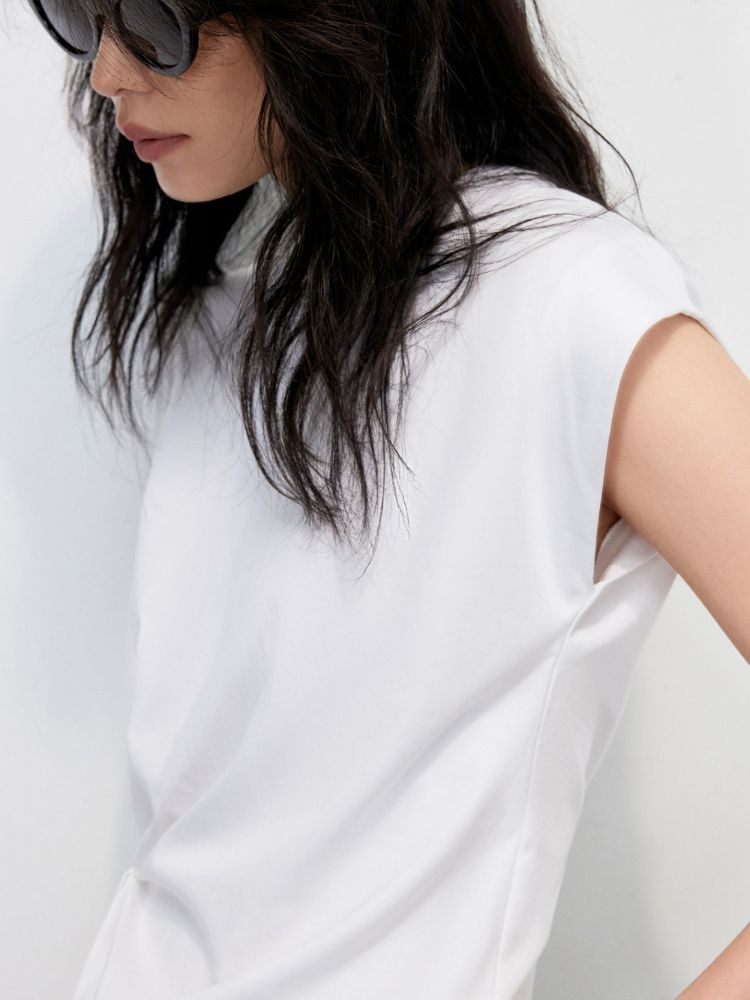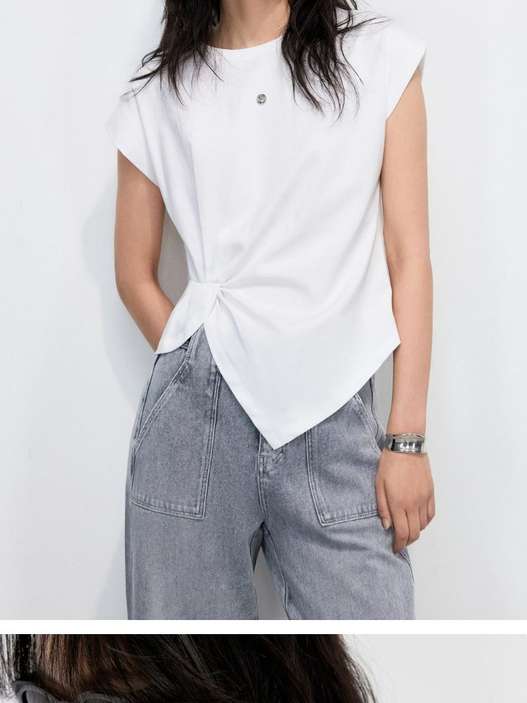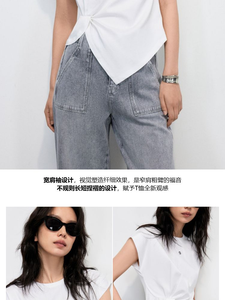 【不规则捏褶】2025夏季柔软亲肤宽肩袖圆领T恤女 371610