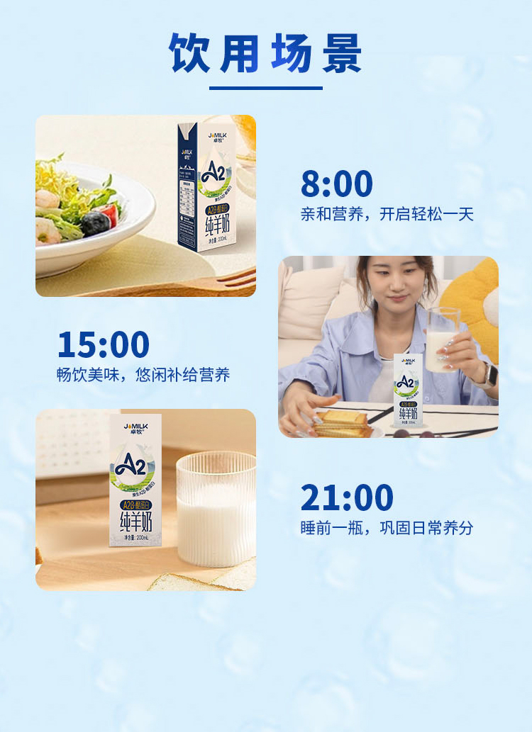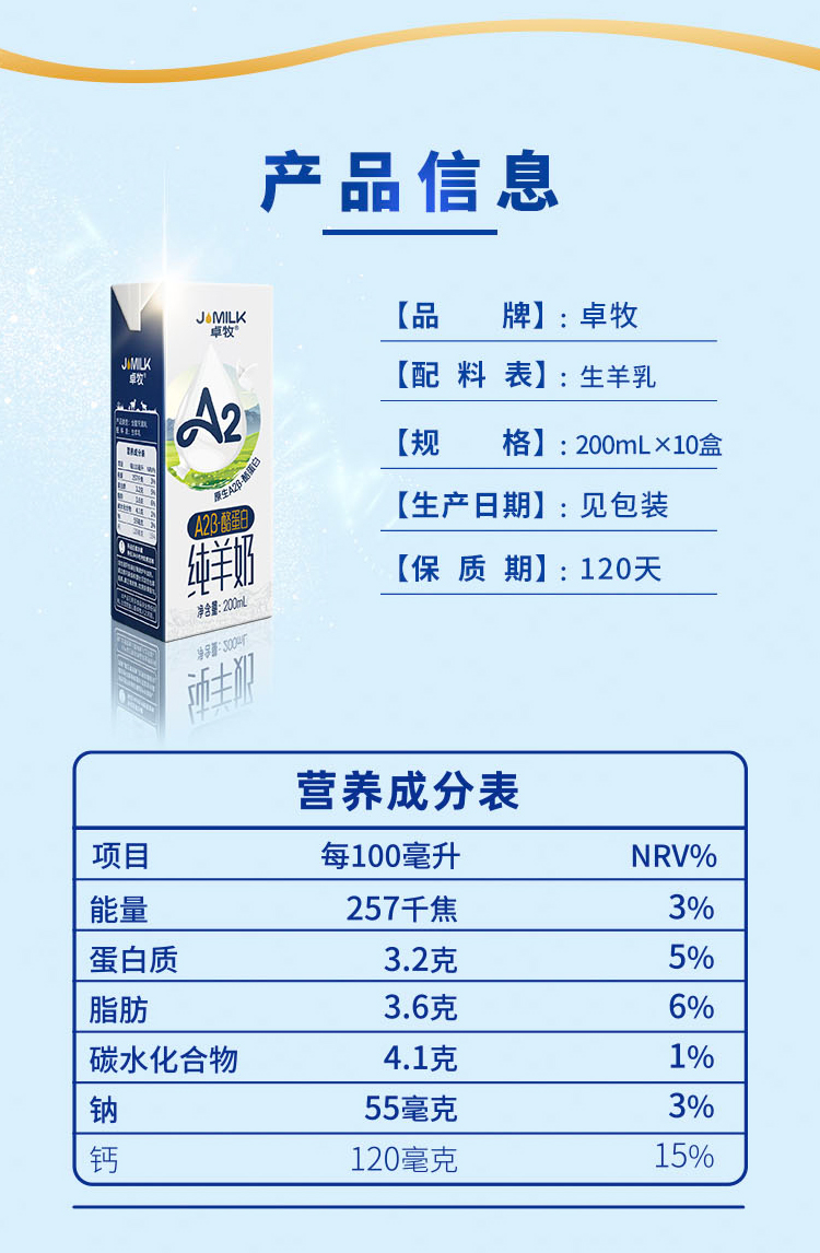 商品名称:JOMILK/卓牧A2β-酪蛋白纯羊奶整箱200g*10盒