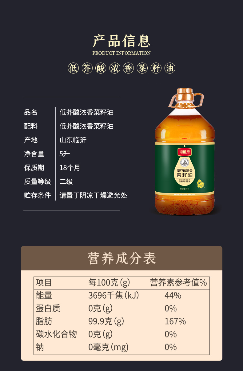 商品名称:裕道府低芥酸菜籽油5L
