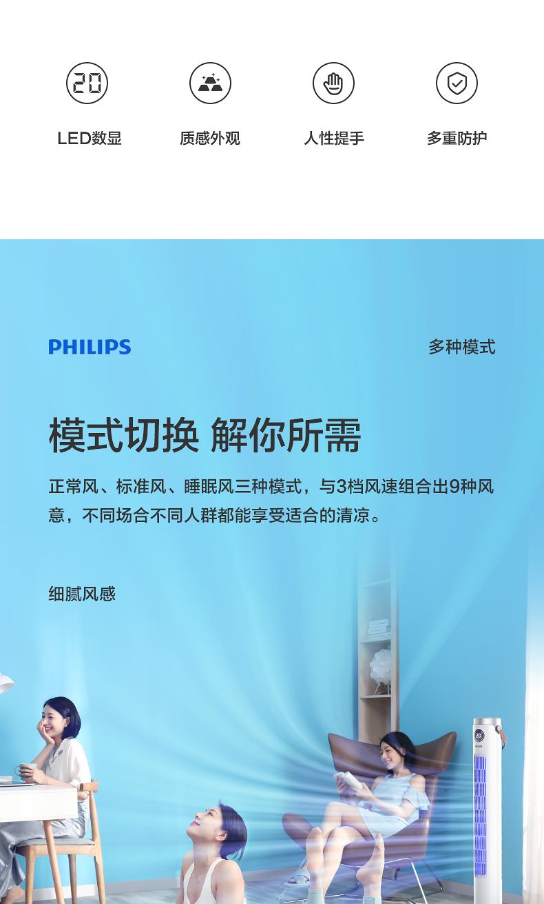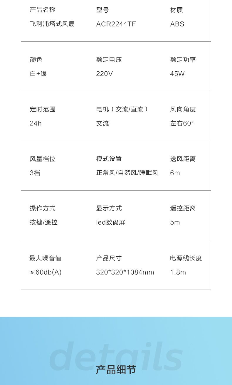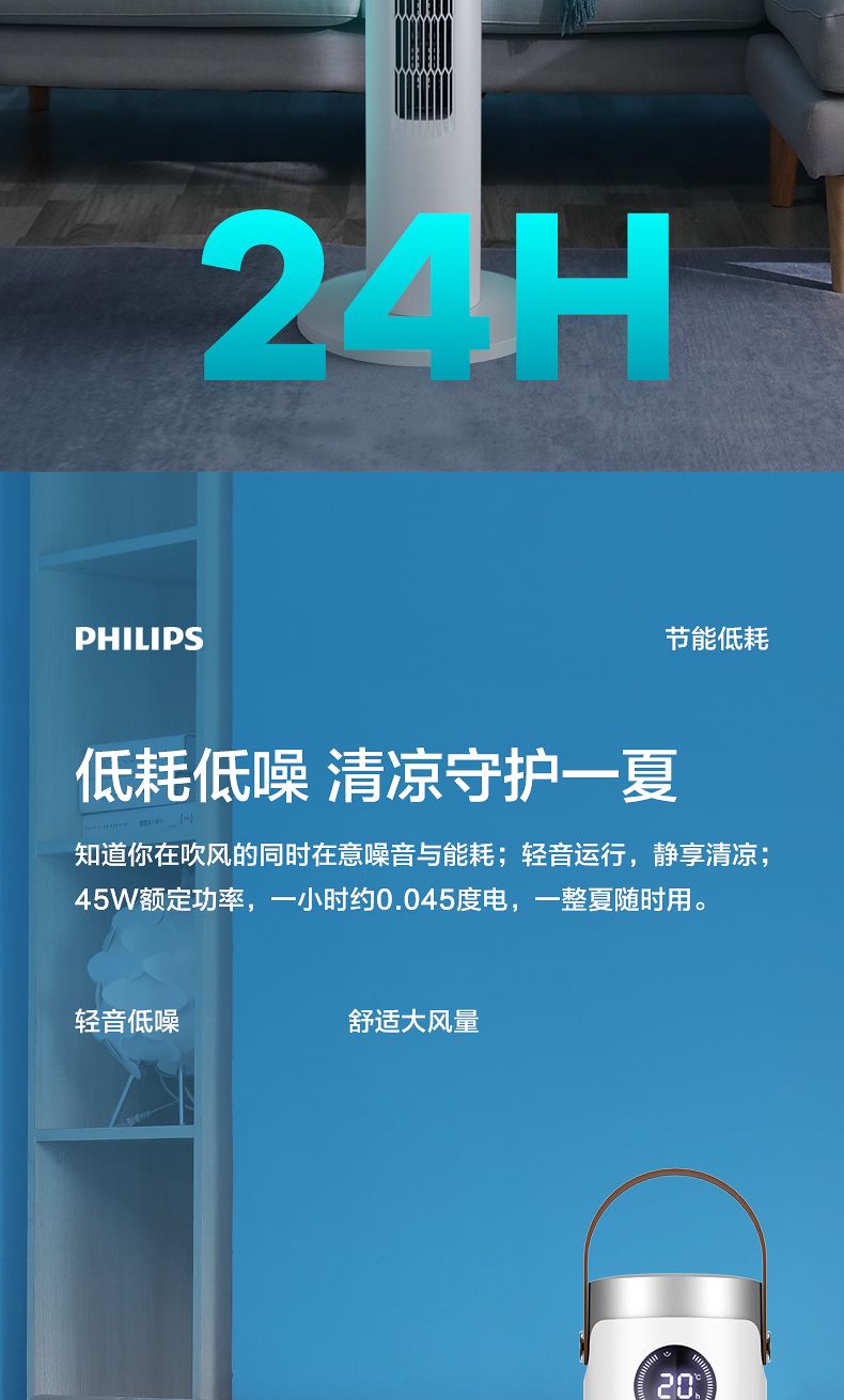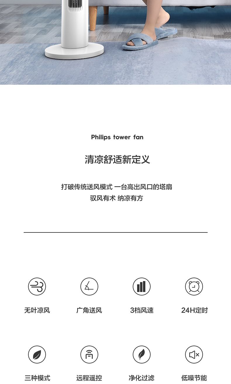 商品名称:飞利浦塔扇ACR2244TF 节能轻音无叶风扇落地式家用立式大风量电风扇白色
