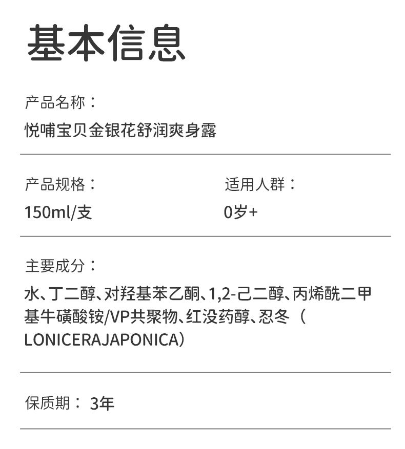 商品名称:悦哺 金银花舒润爽身露 150ml/瓶