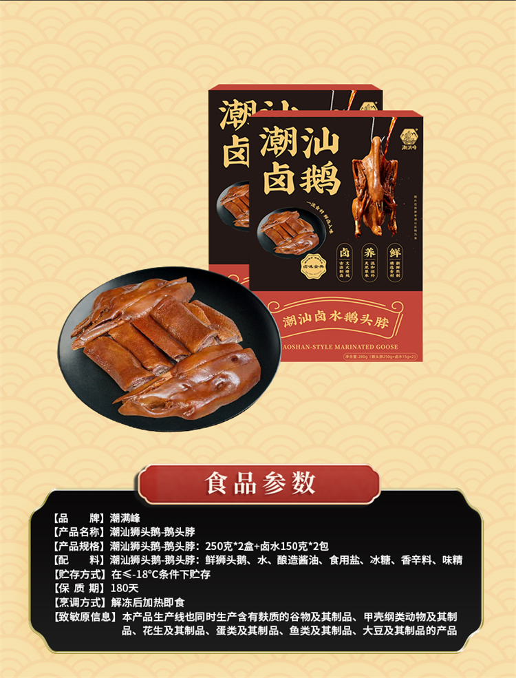 商品名称:潮满峰潮汕狮头鹅卤鹅头脖250g*2盒