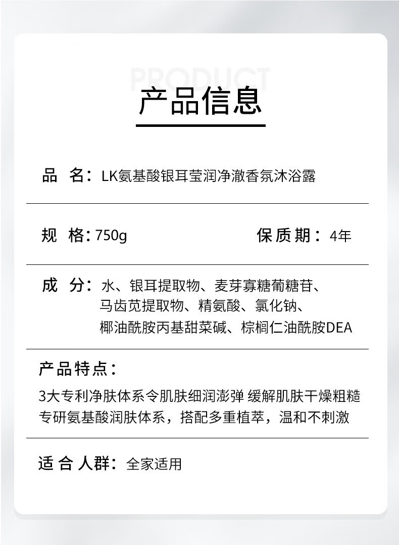 商品名称:LK 氨基酸银耳盈润净澈香氛沐浴露-栀子花香型750g LKZS010