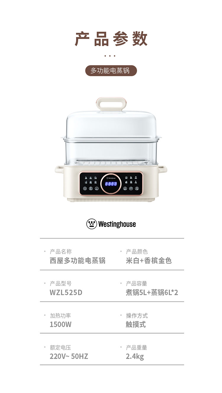 商品名称:Westinghouse/西屋多功能电蒸锅5升煮锅+6升蒸锅*2 WZL525D