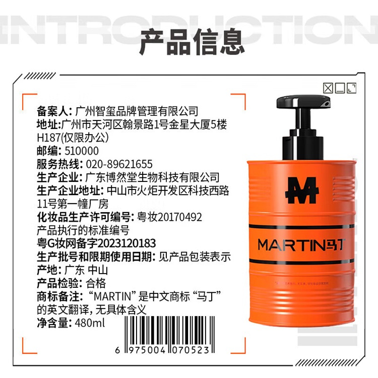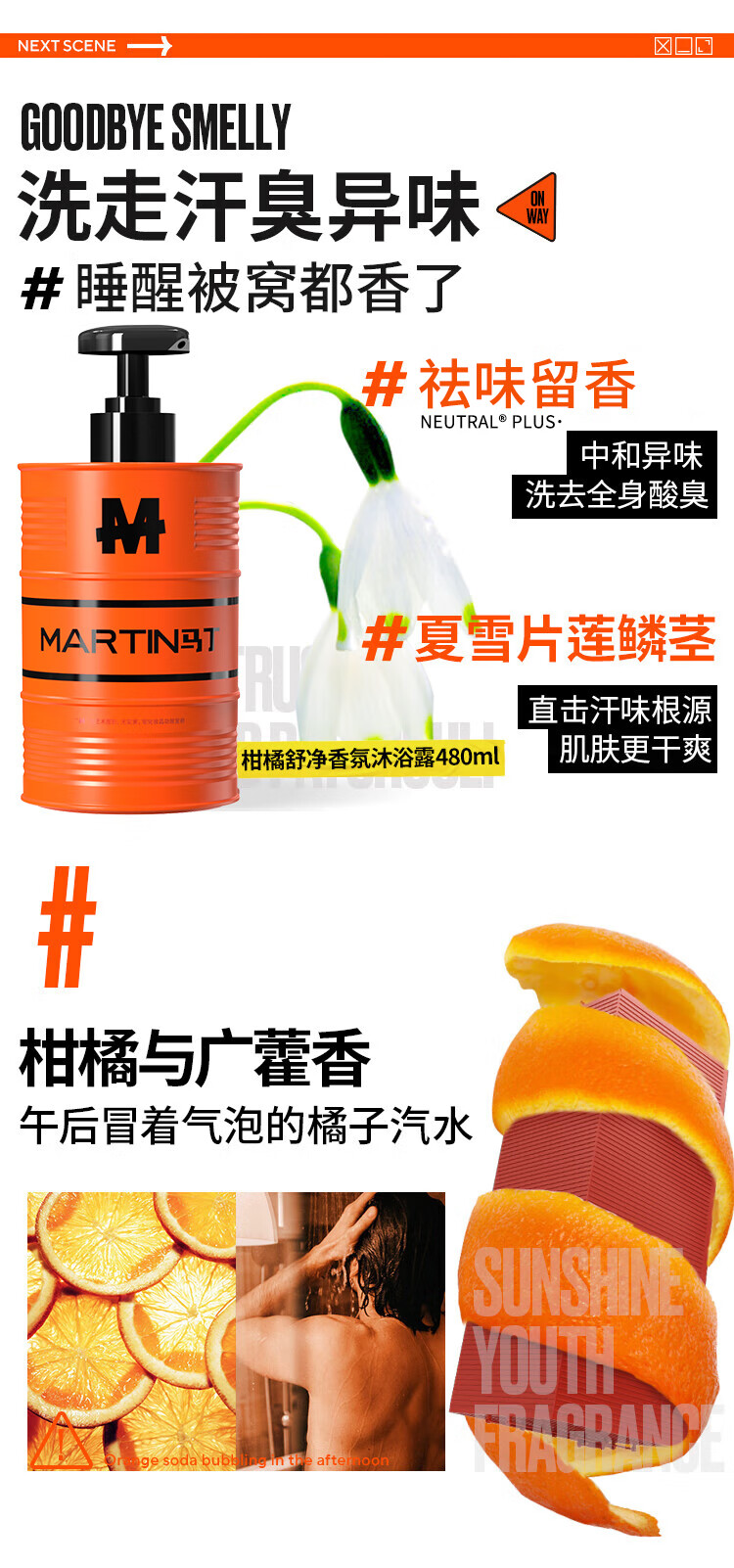 商品名称:MARTIN/马丁舒净香氛橙桶沐浴露-柑橘与广霍香型480g cjmd41109