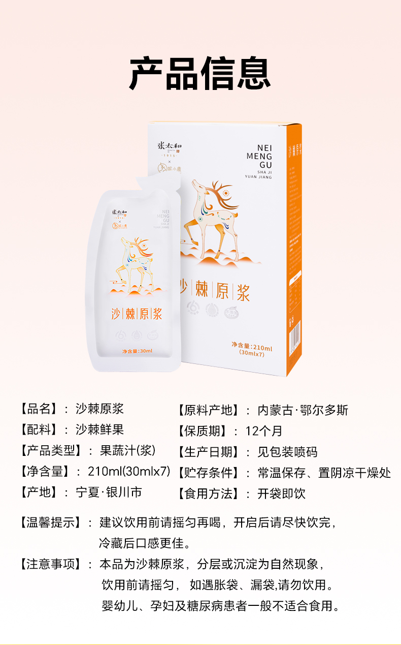 商品名称:张太和沙棘原浆210ml*2盒