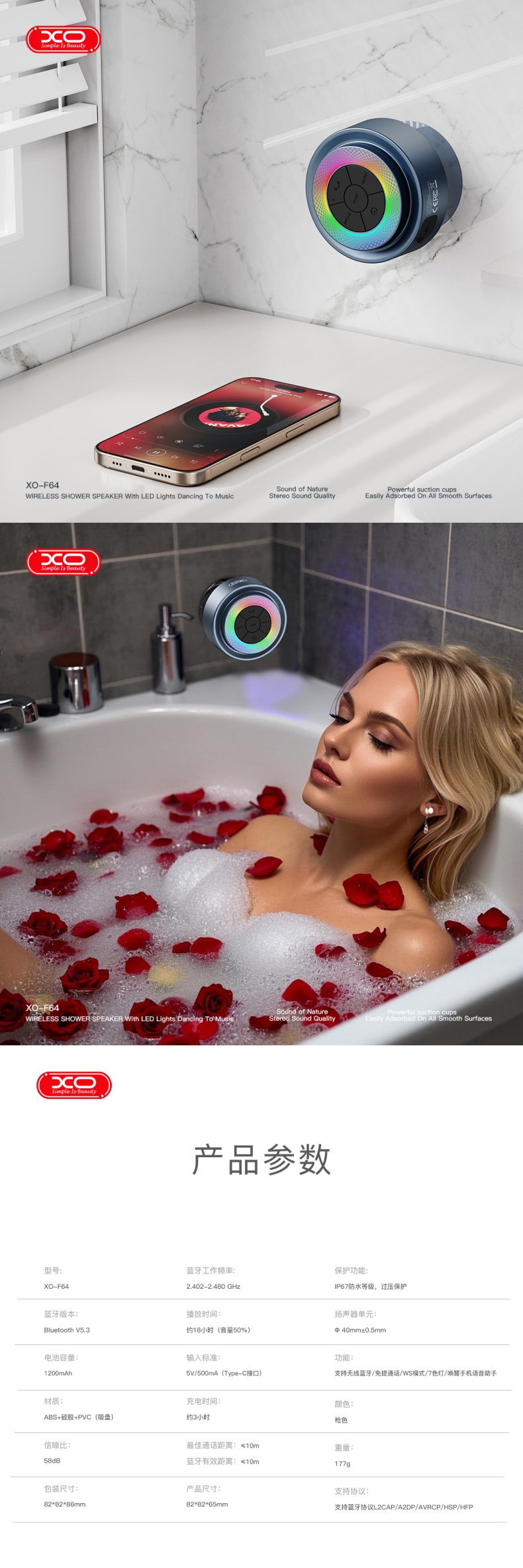 商品名称:XO Simple Is Beauty浴室防水吸盘蓝牙音箱XO-F64