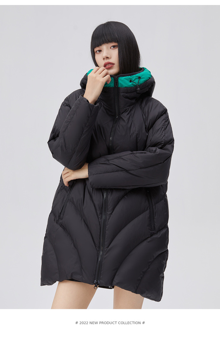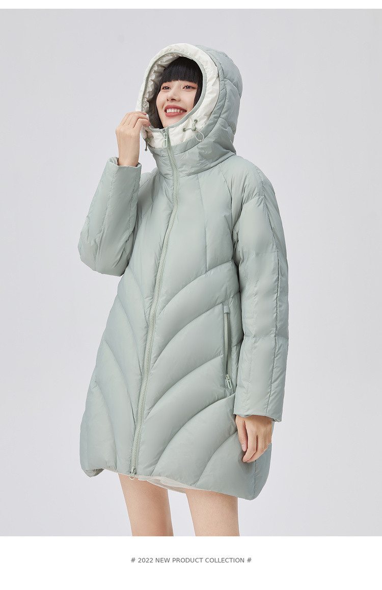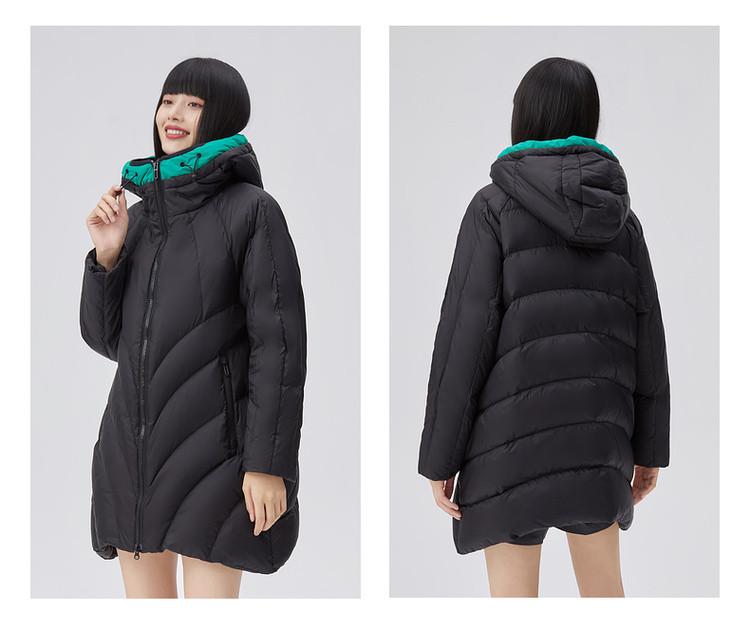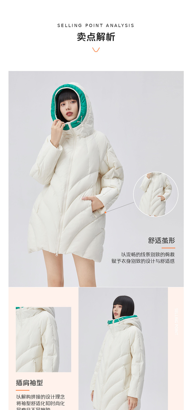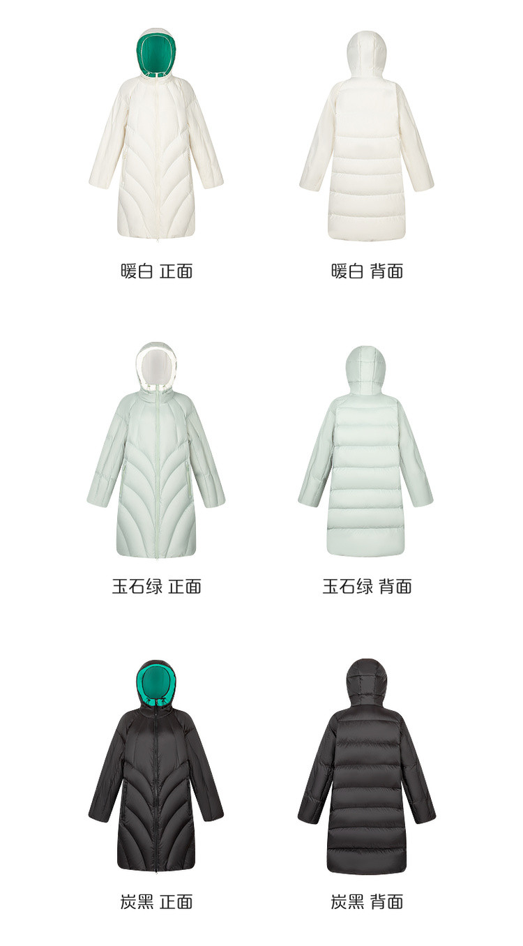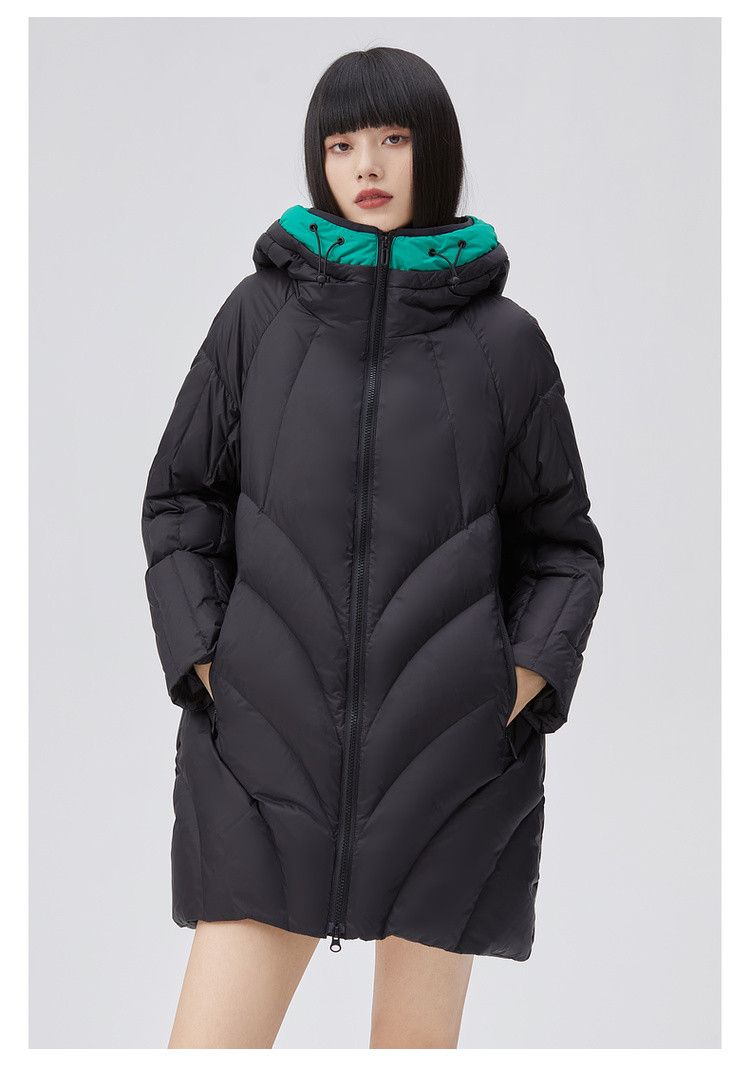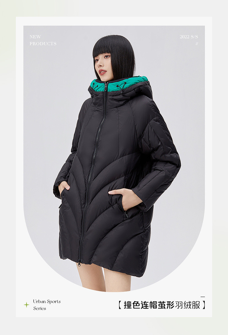 商品名称:【90鸭绒】茧型长款连帽直筒保暖羽绒服女 246870