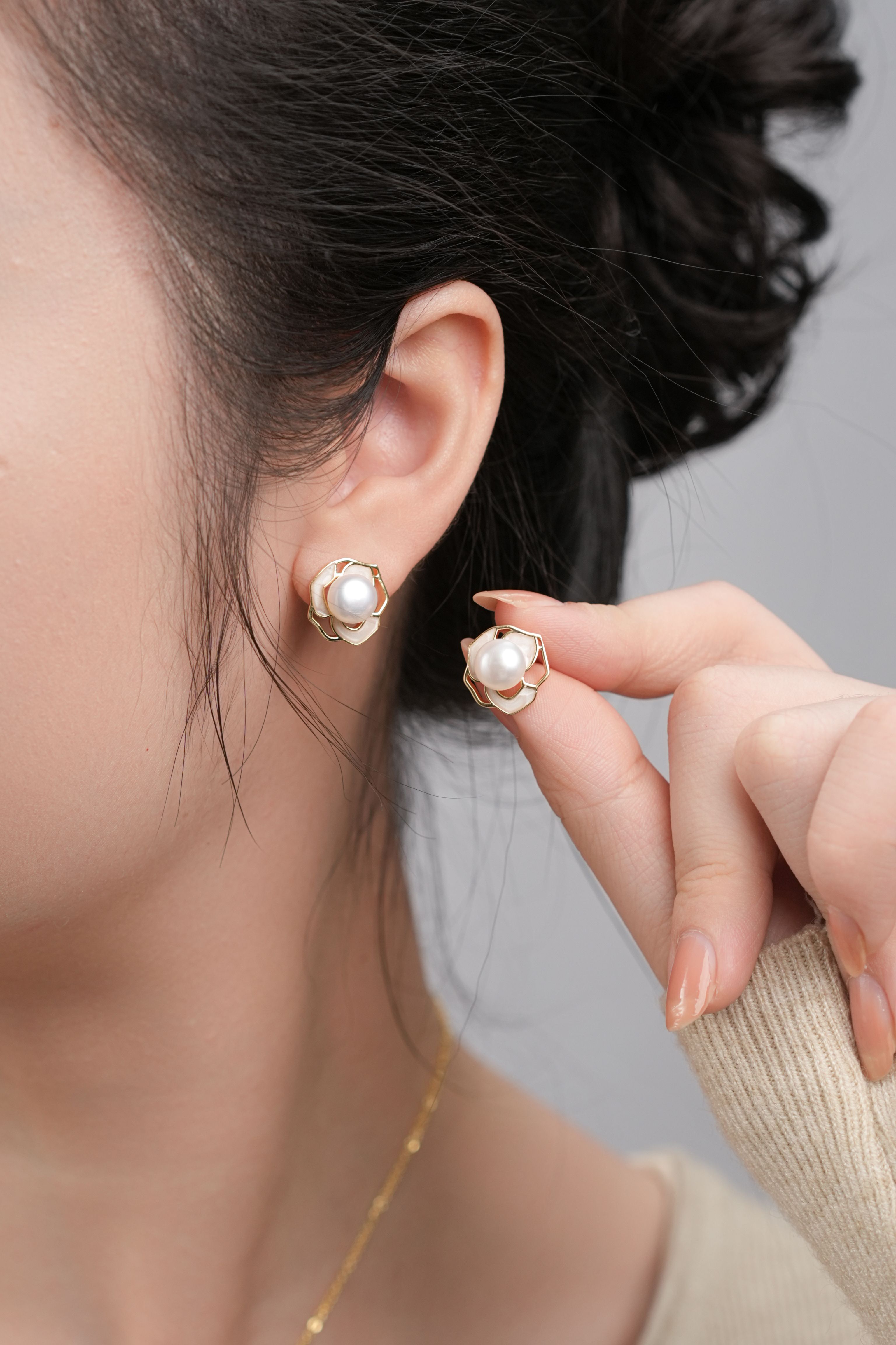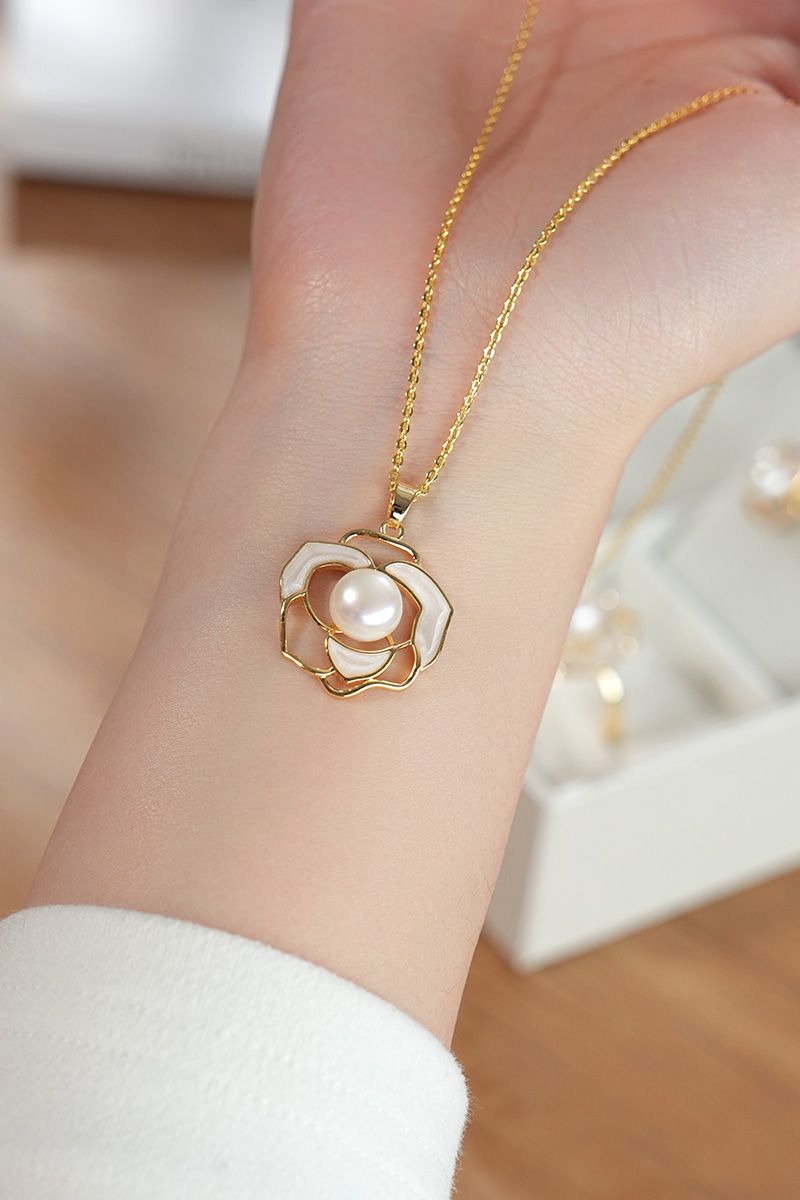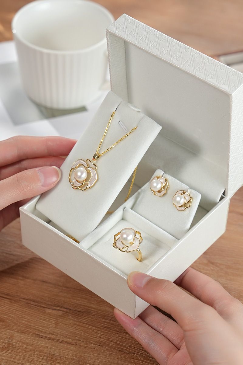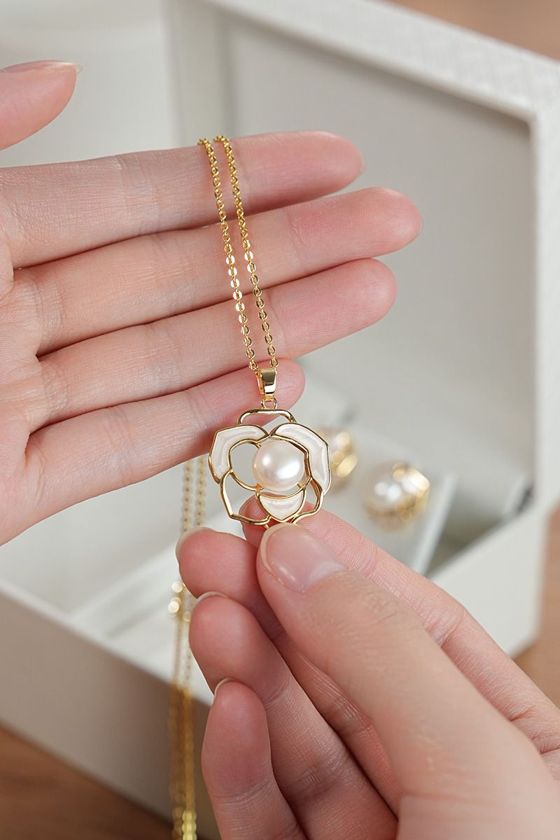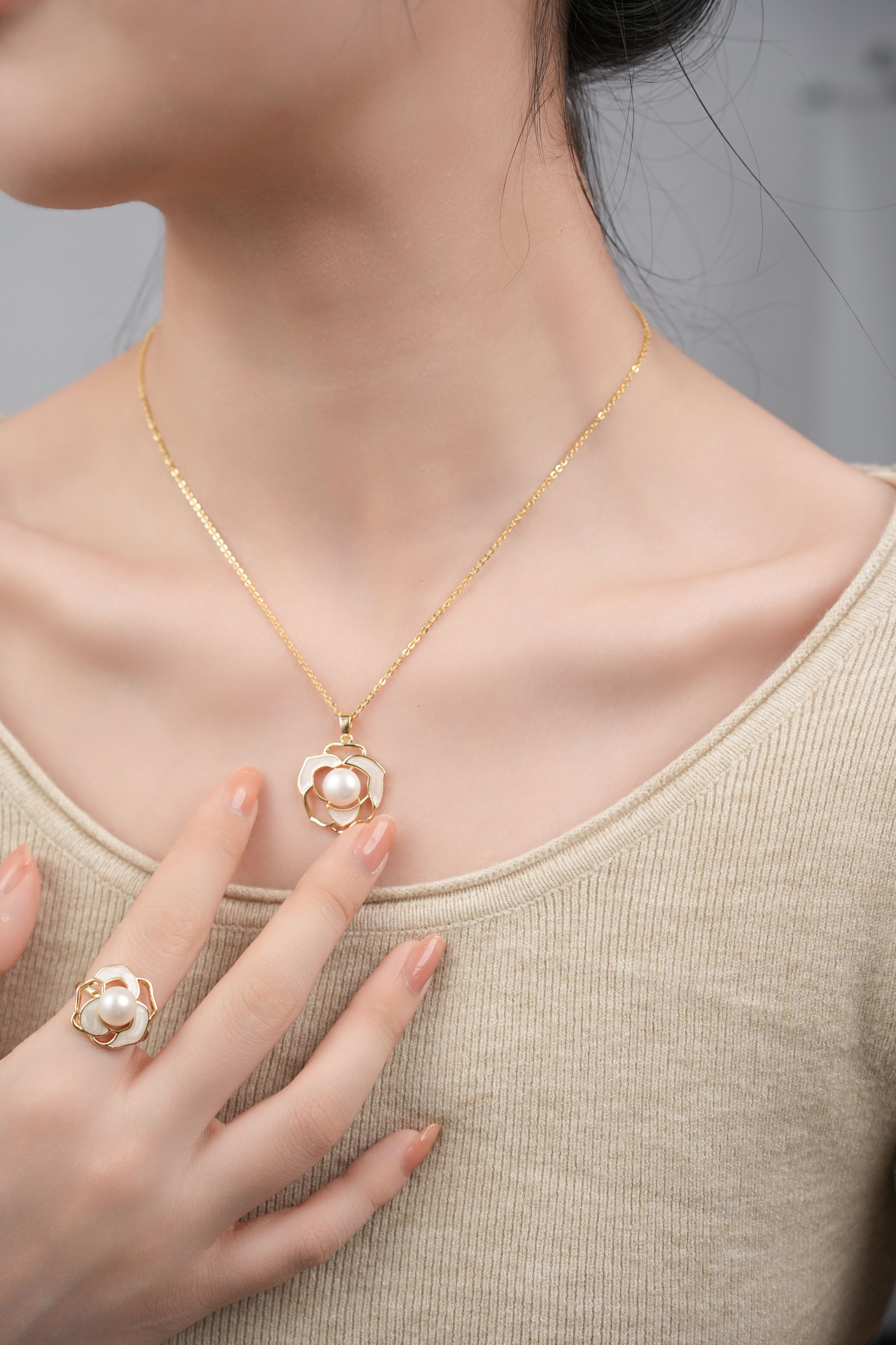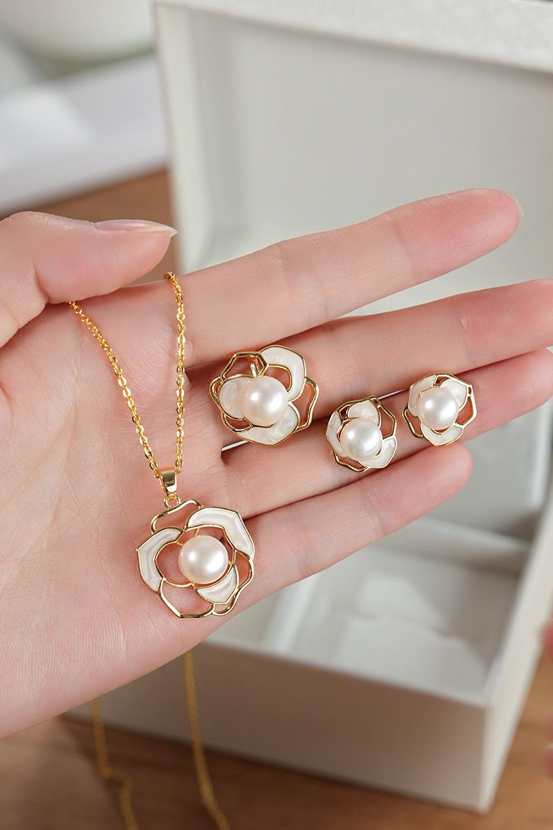 商品名称:(附证书)《花容珠貌》小香风山茶花天然淡水珍珠吊坠款项链戒指耳钉3件套礼盒