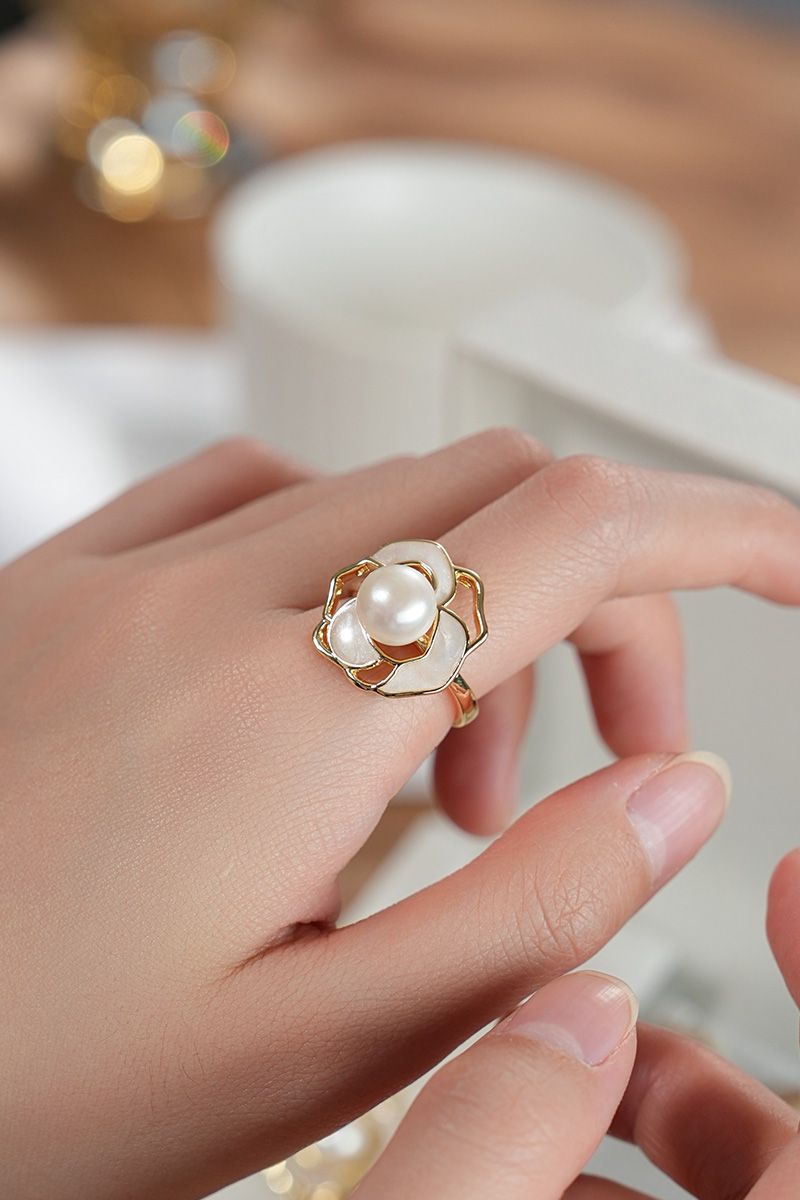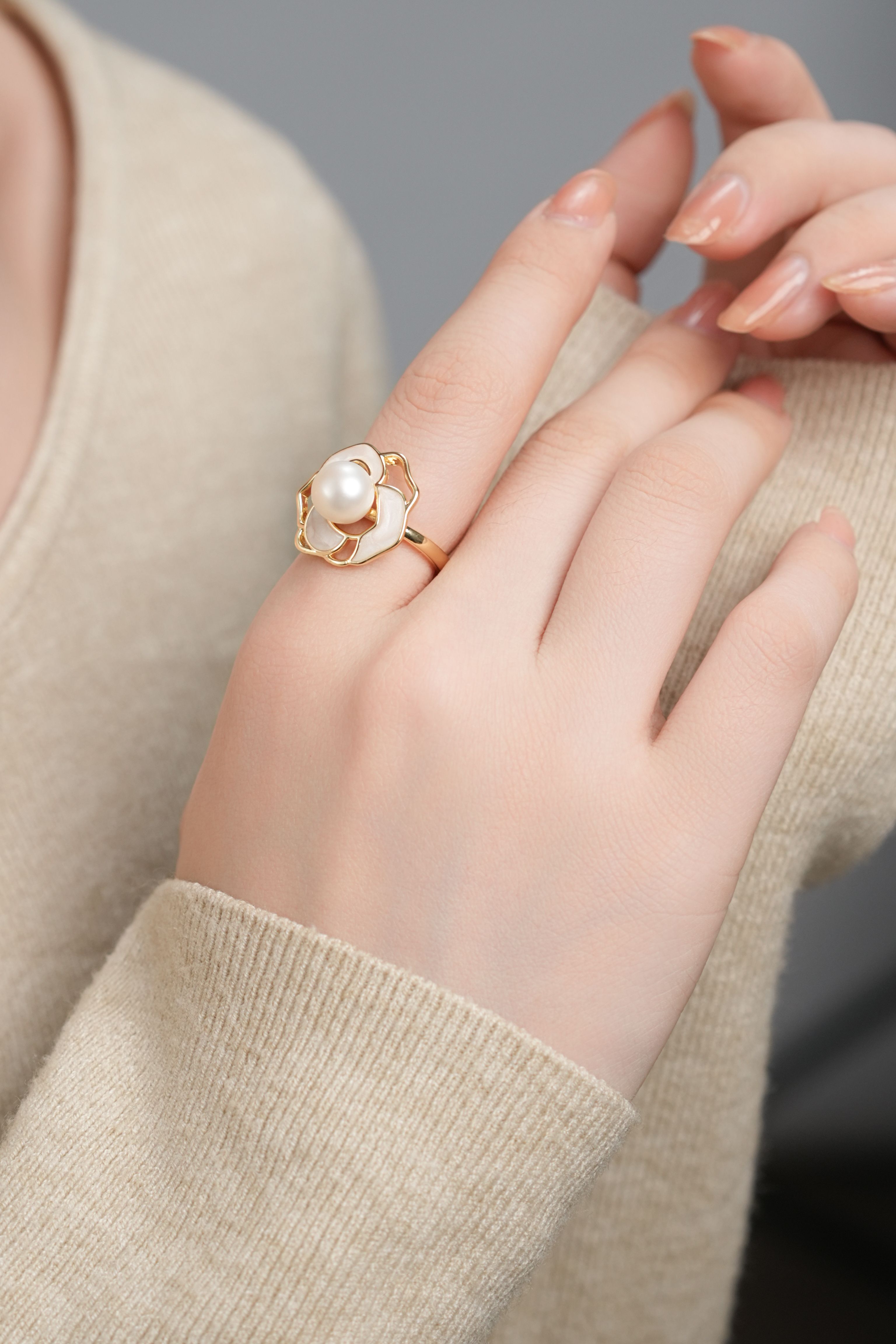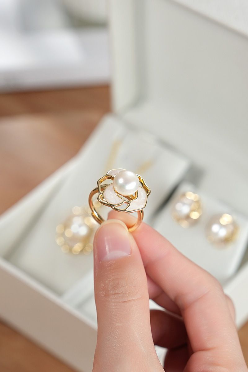 (附证书)《花容珠貌》小香风山茶花天然淡水珍珠吊坠款项链戒指耳钉3件套礼盒