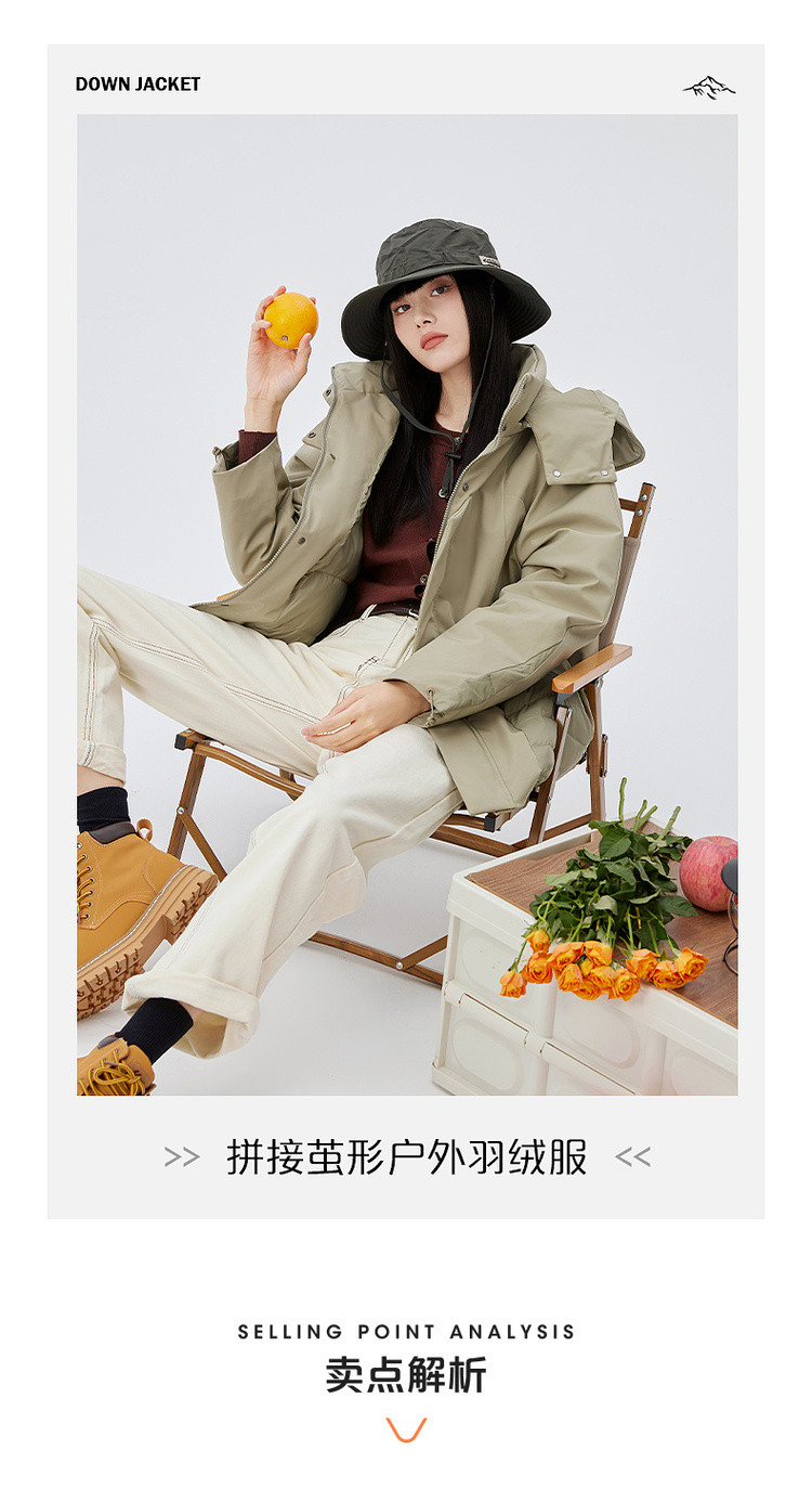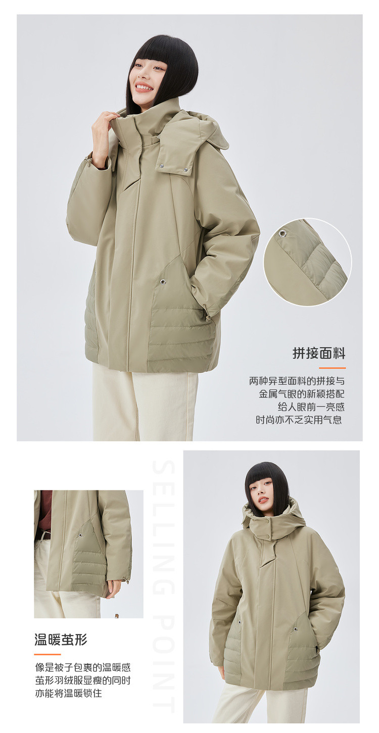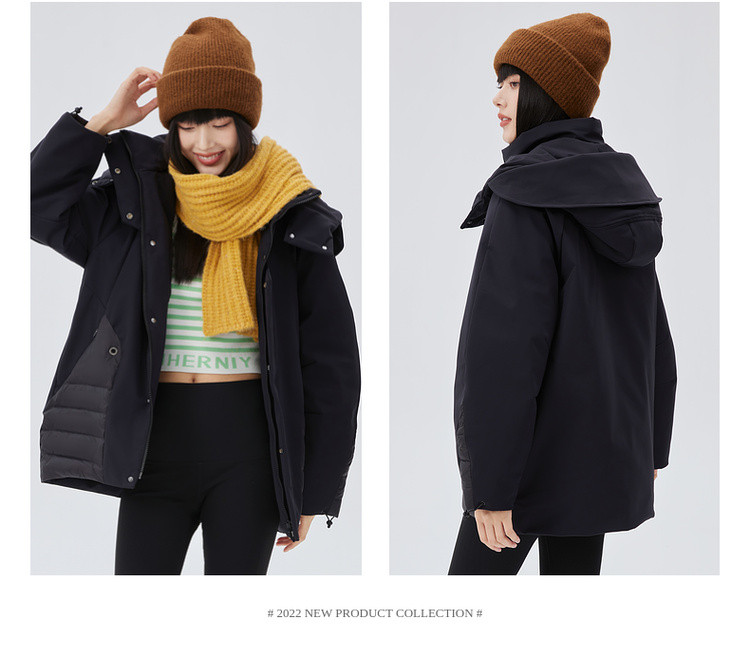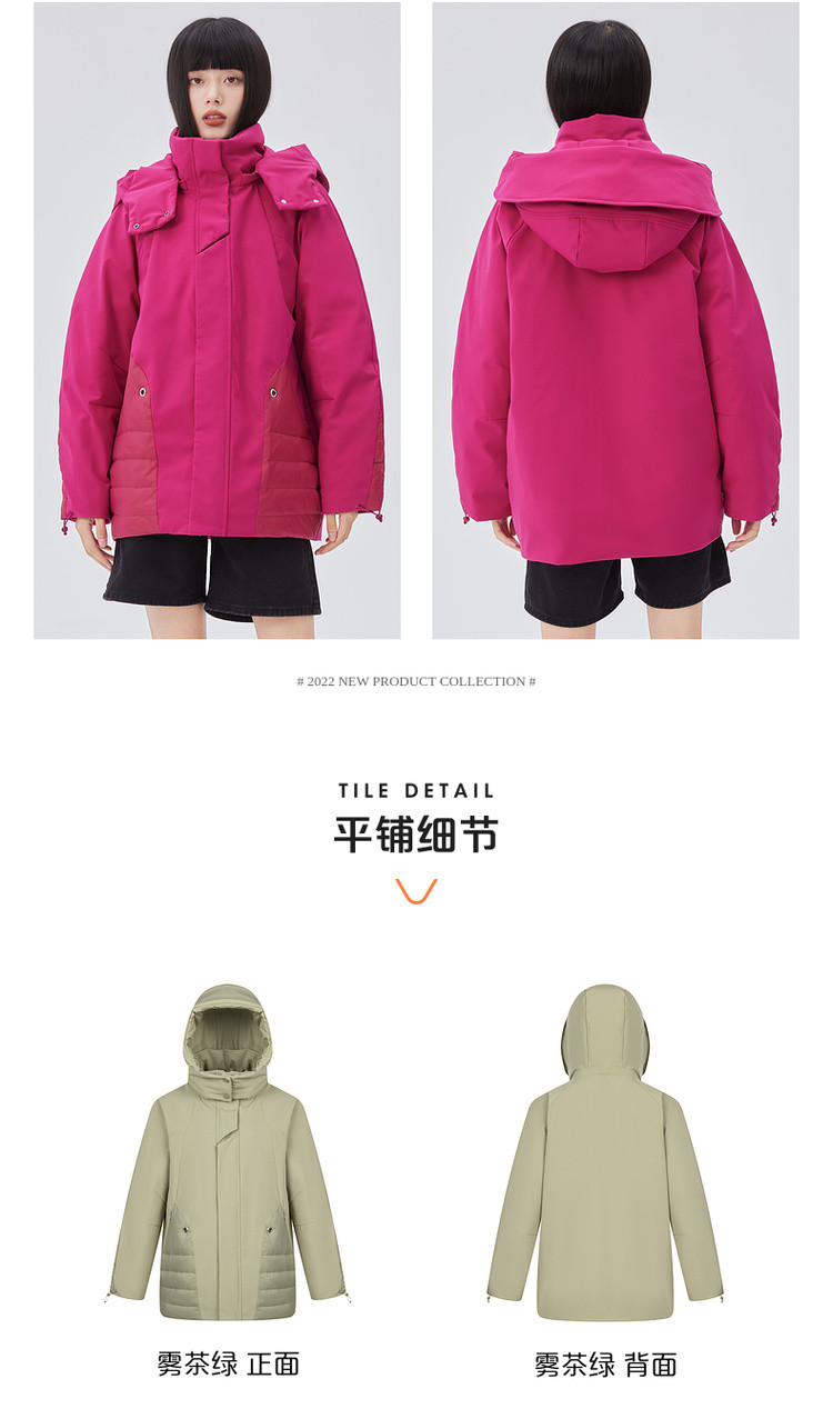 商品名称:时尚拼色户外工装外套保暖加厚短款鹅绒服户外羽绒服女 568342