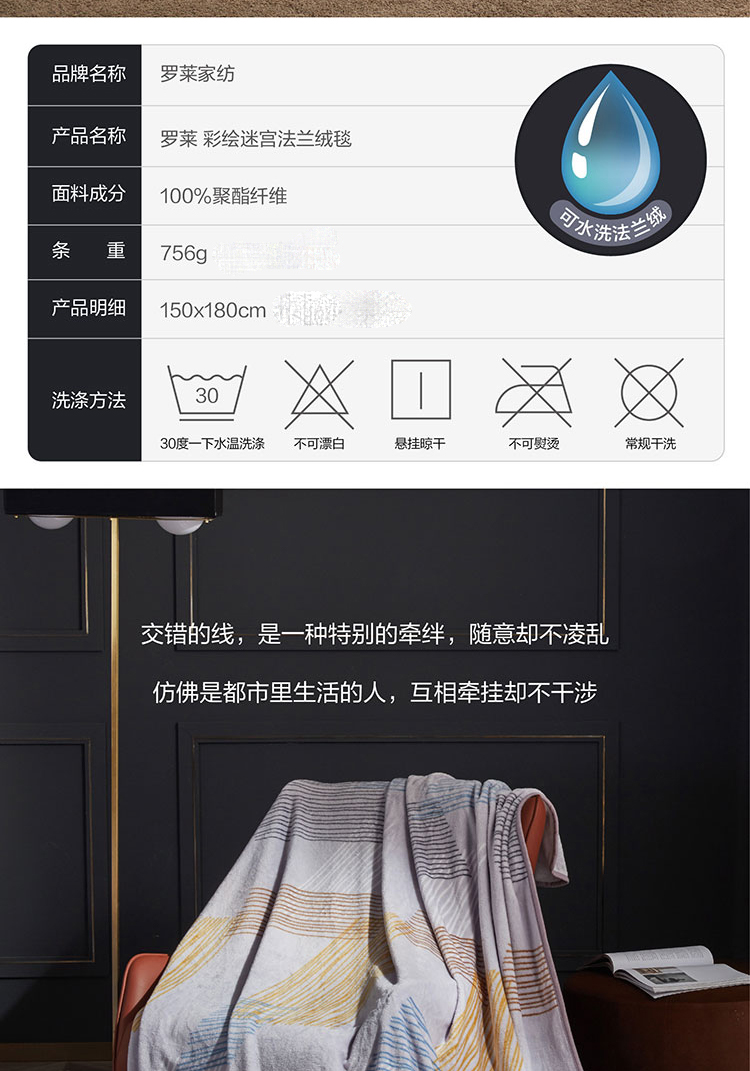 商品名称:LUOLAI/罗莱家纺彩绘迷宫法兰绒毯150*180cm 756g