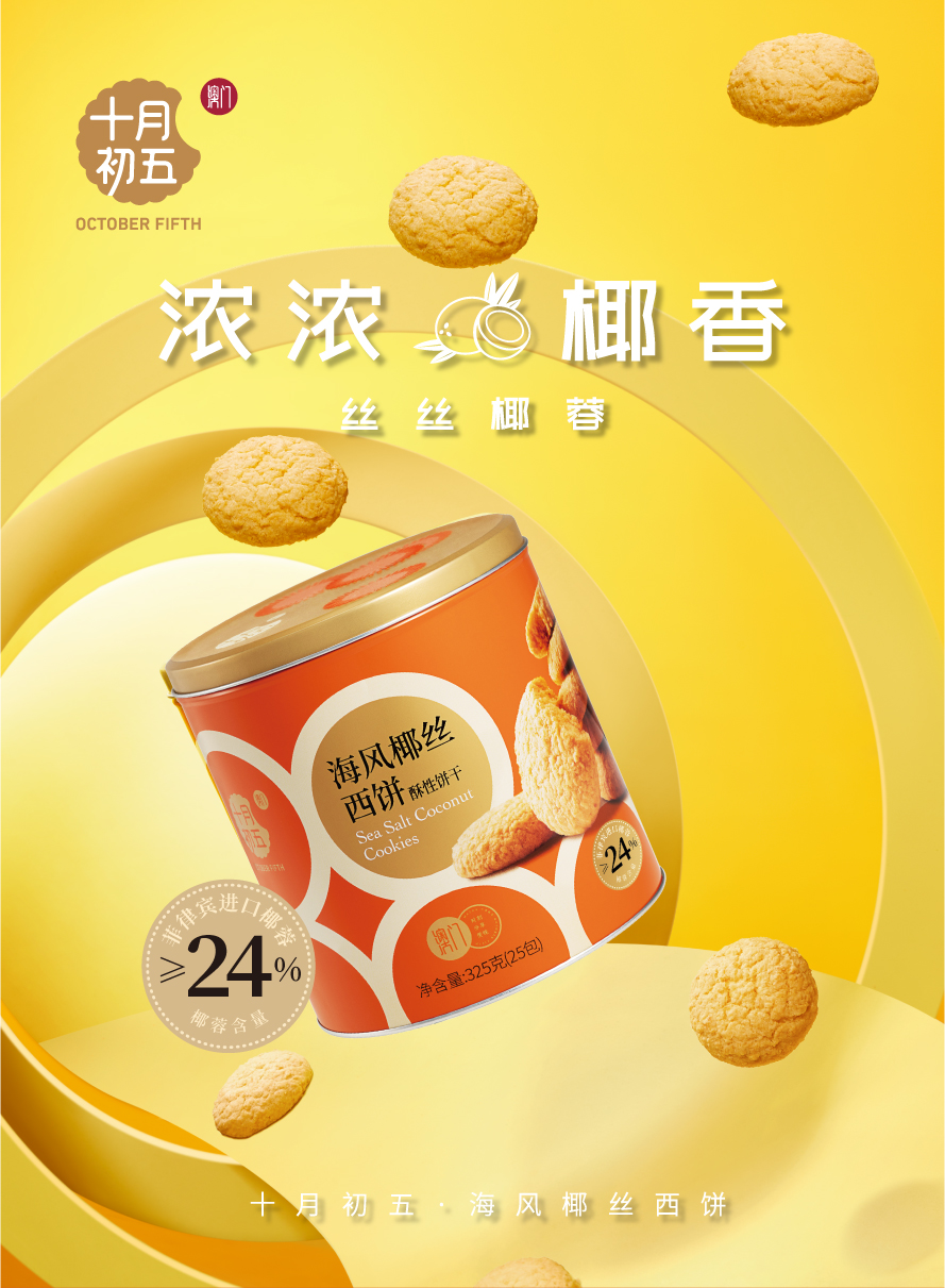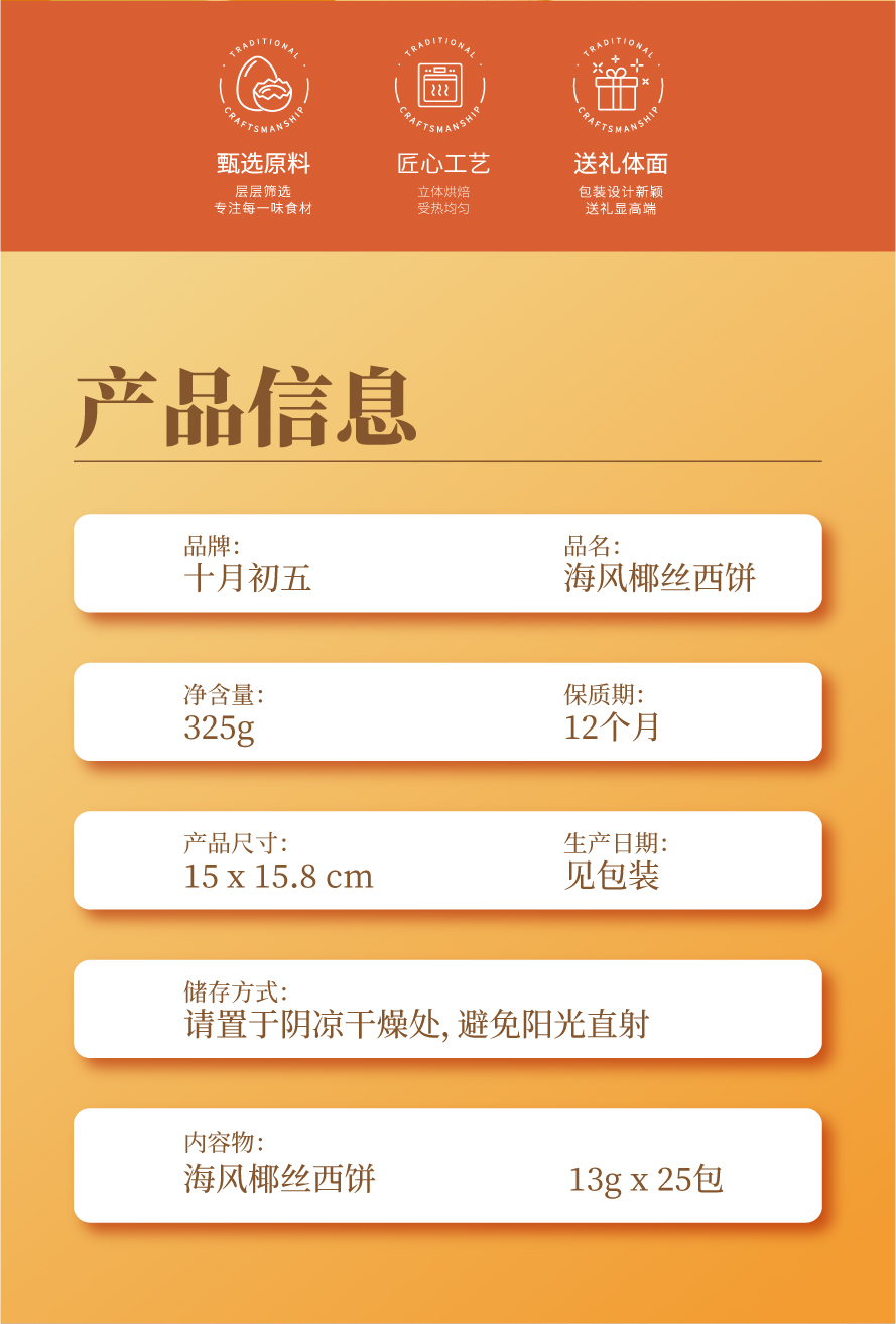 商品名称:十月初五海风椰丝西饼(圆罐)饼干礼盒325g