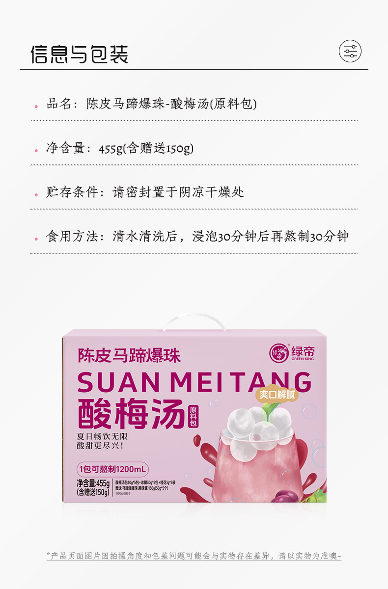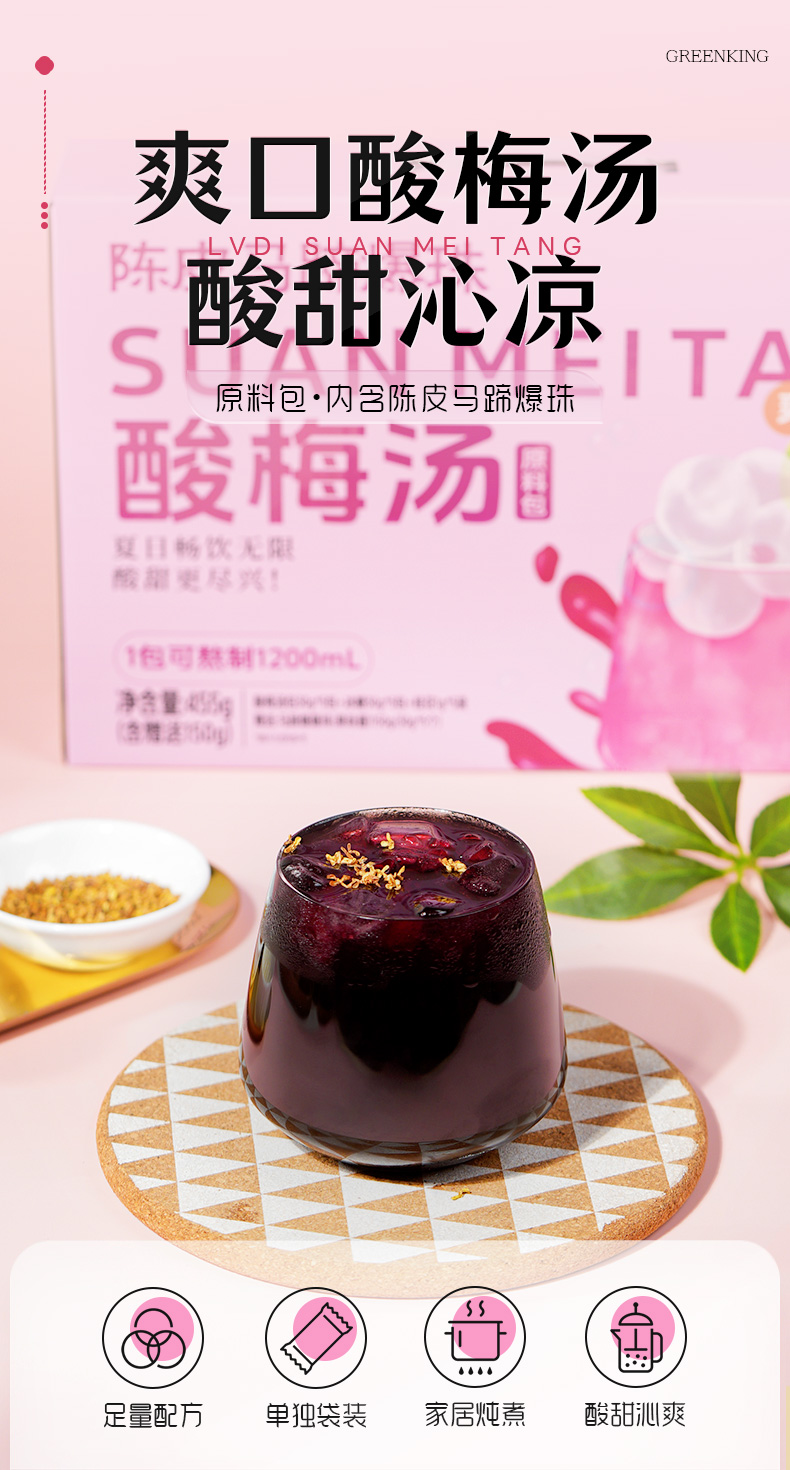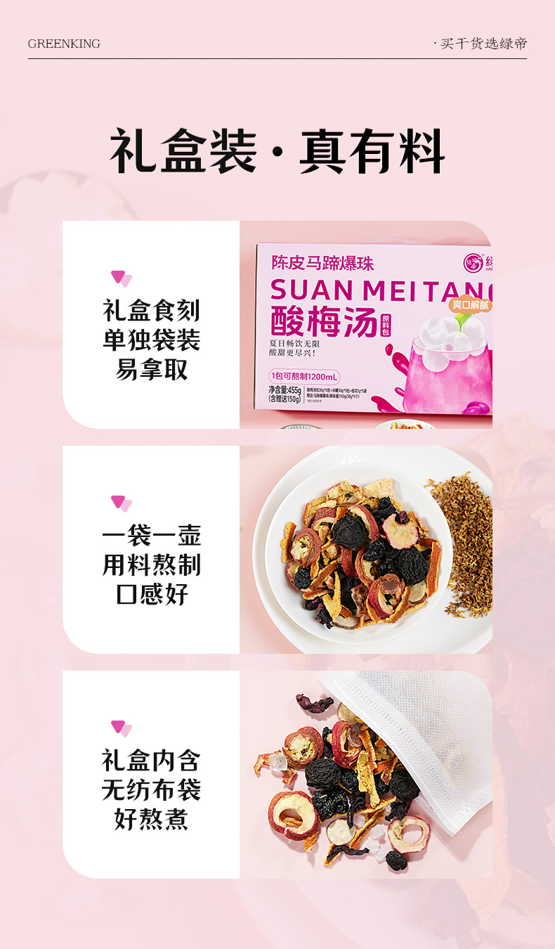商品名称:GREEN KING/绿帝陈皮马蹄爆珠酸梅汤原料包礼盒455g