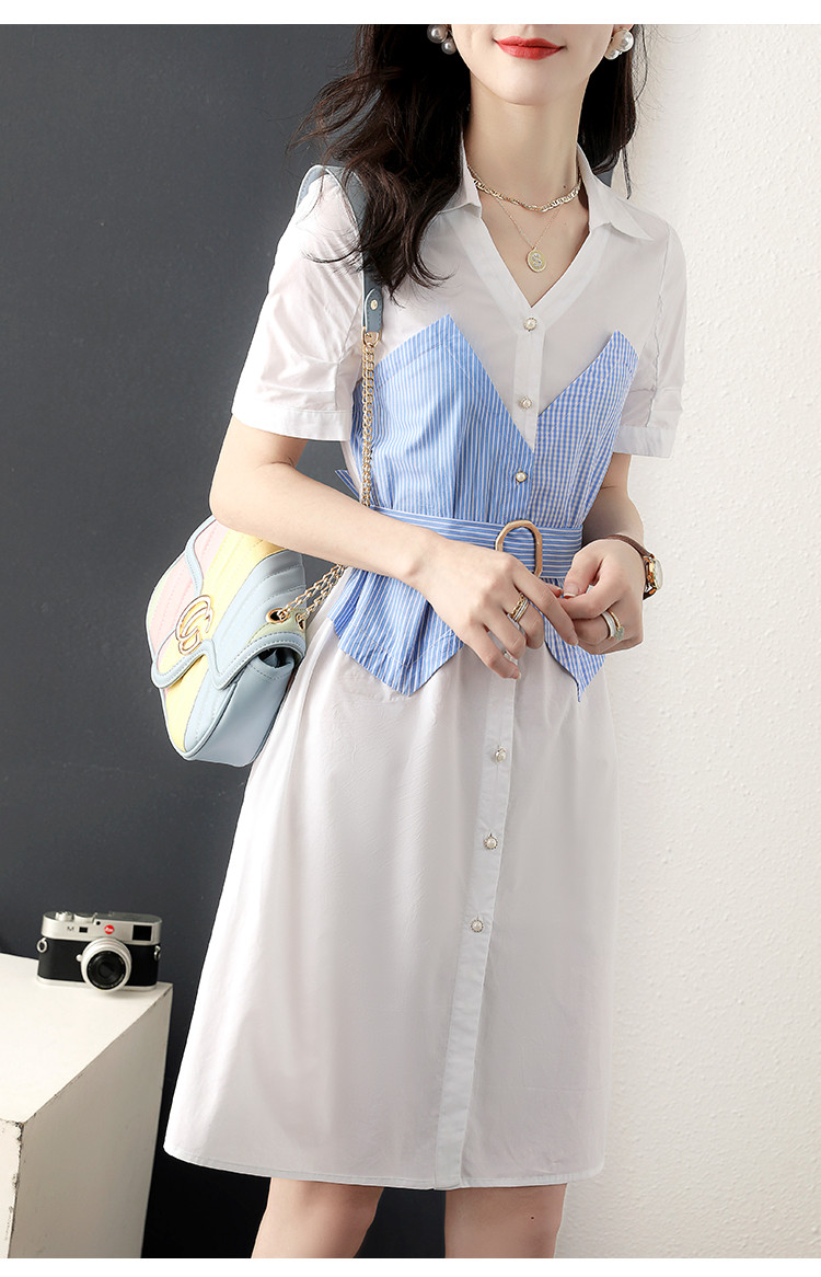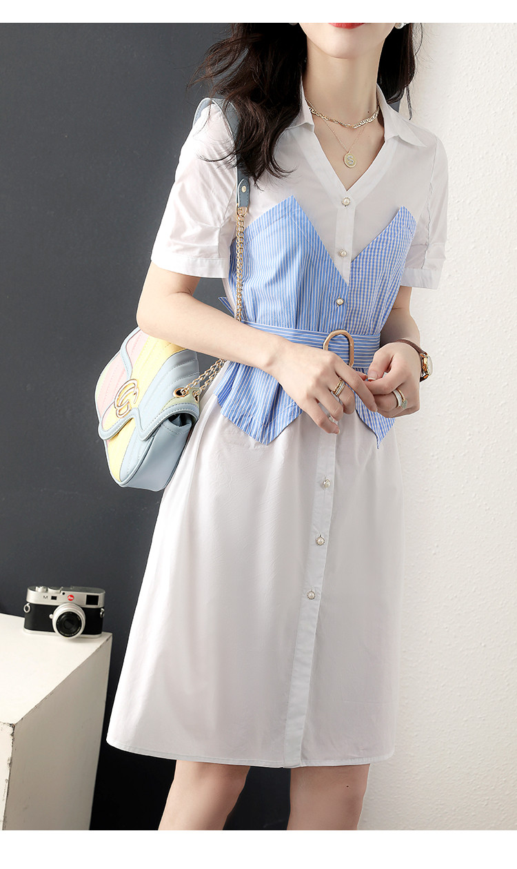 2025夏季新款文艺休闲藏肉修身显瘦减龄拼接条纹衬衫连衣裙 463753