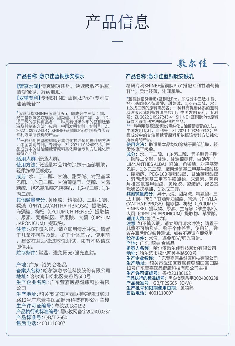 商品名称:敷尔佳 蓝铜肽安肤水100ml/乳50ml