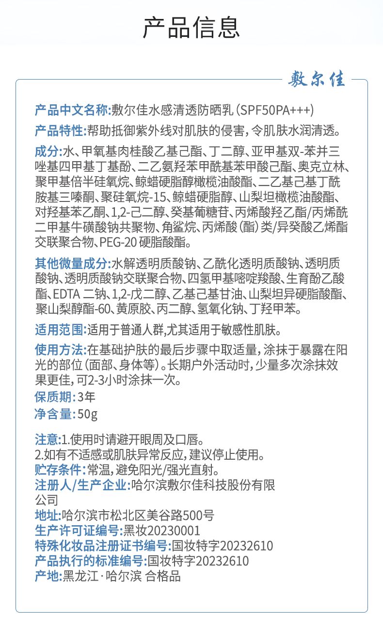 商品名称:敷尔佳 水感清透防晒乳 50ml
