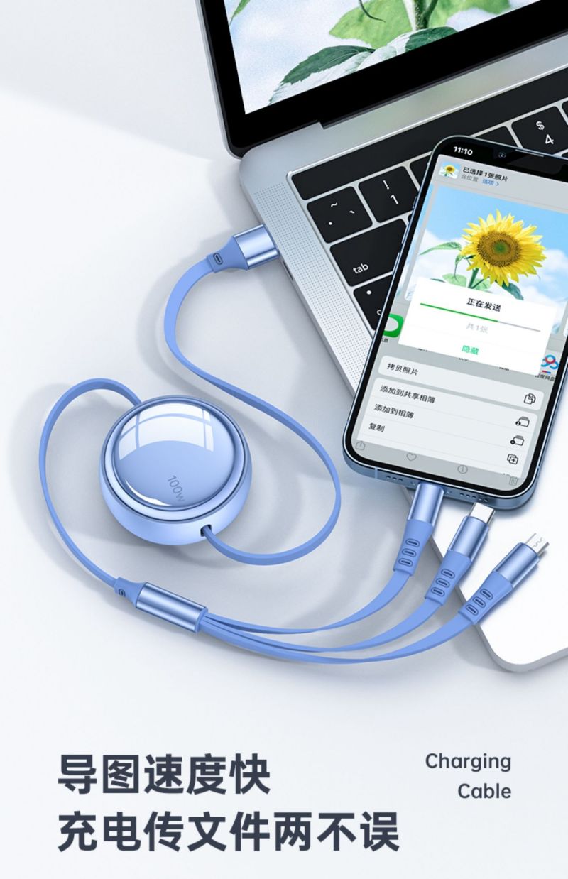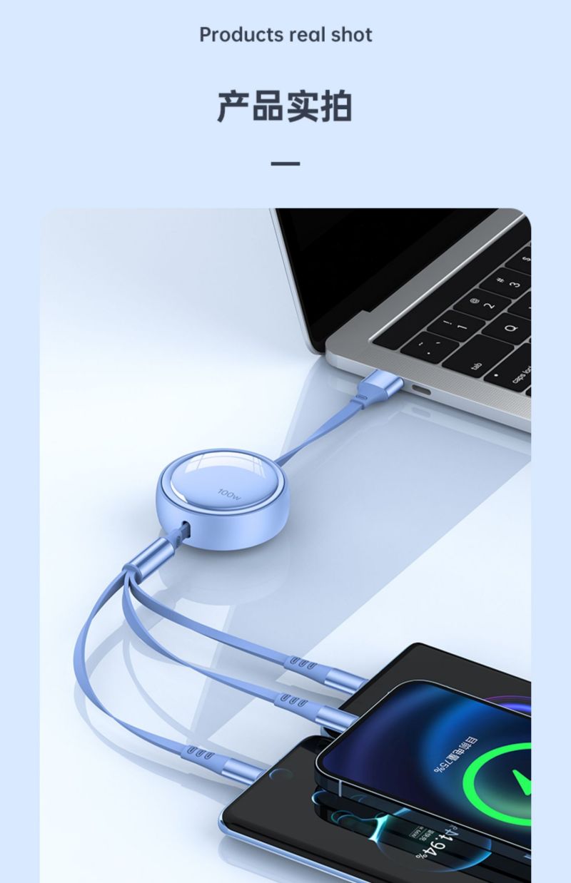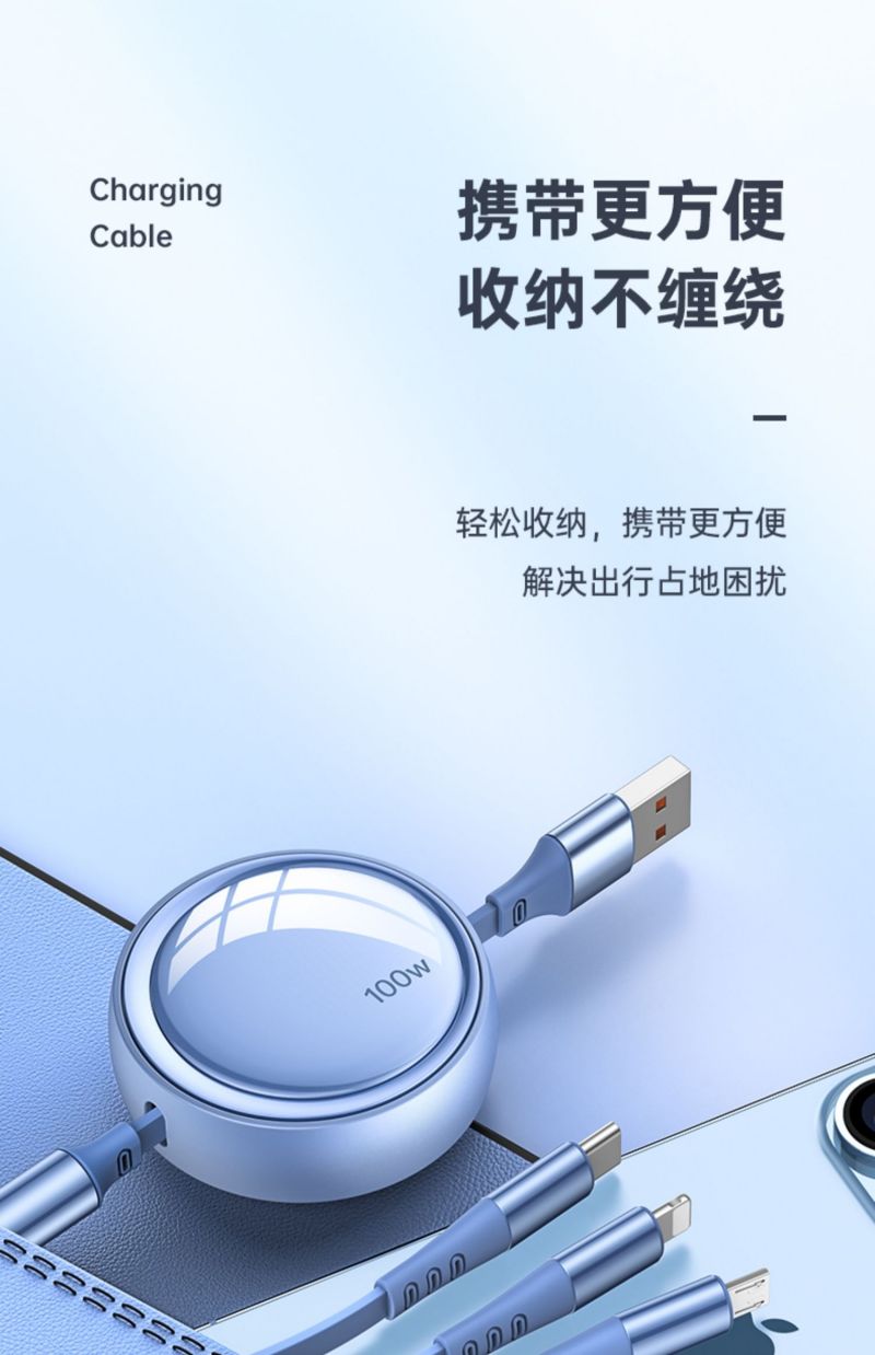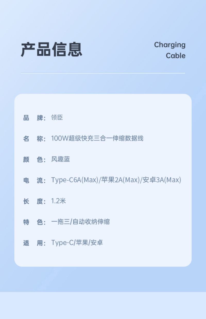 商品名称:LICHEERS/领臣1.2米100W超级快充三合一伸缩数据线-风趣蓝LC-518