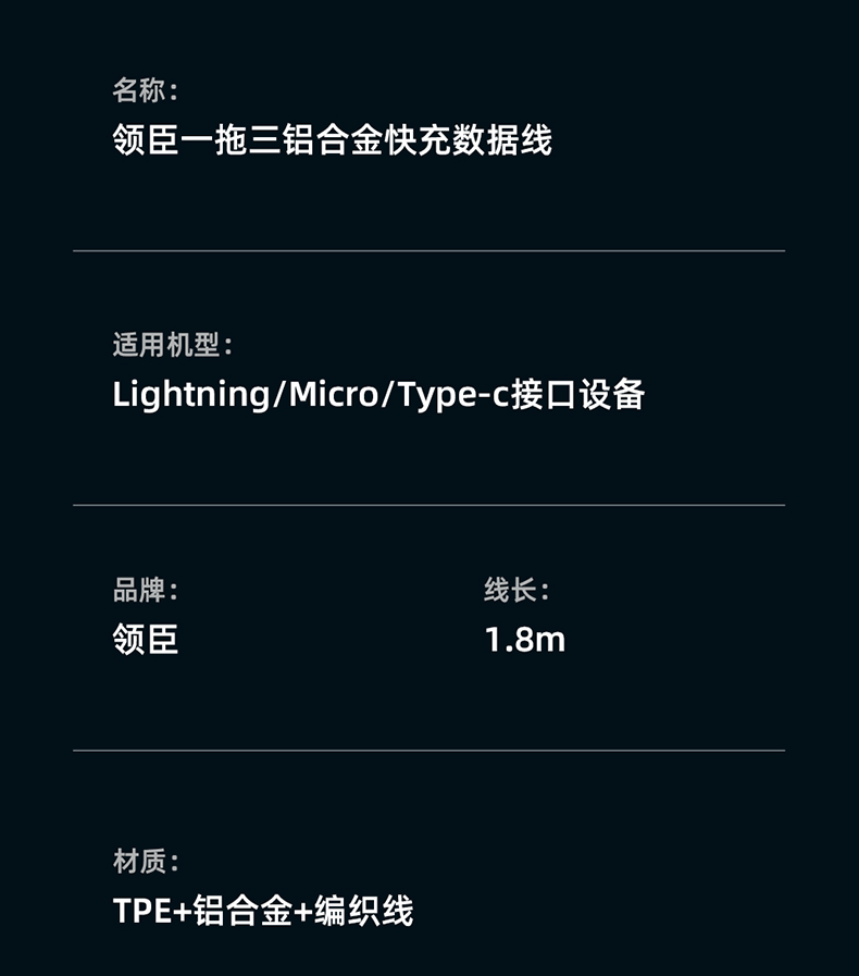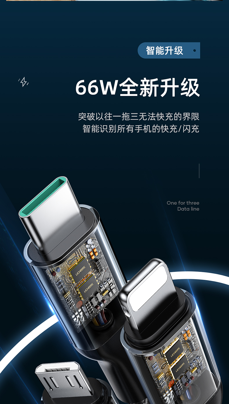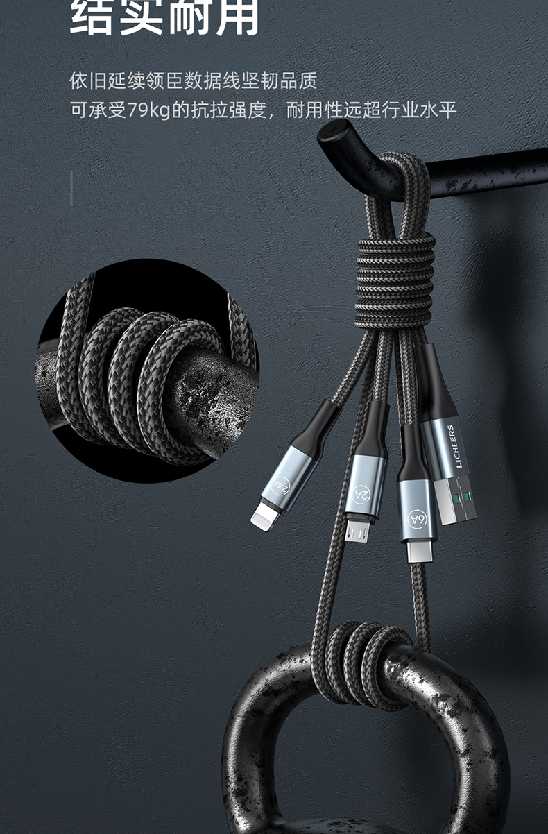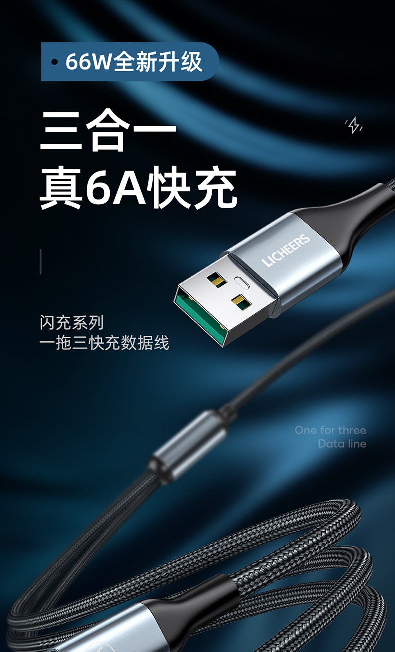 商品名称:LICHEERS/领臣1.8米66W一拖三铝合金快充数据线LC-439