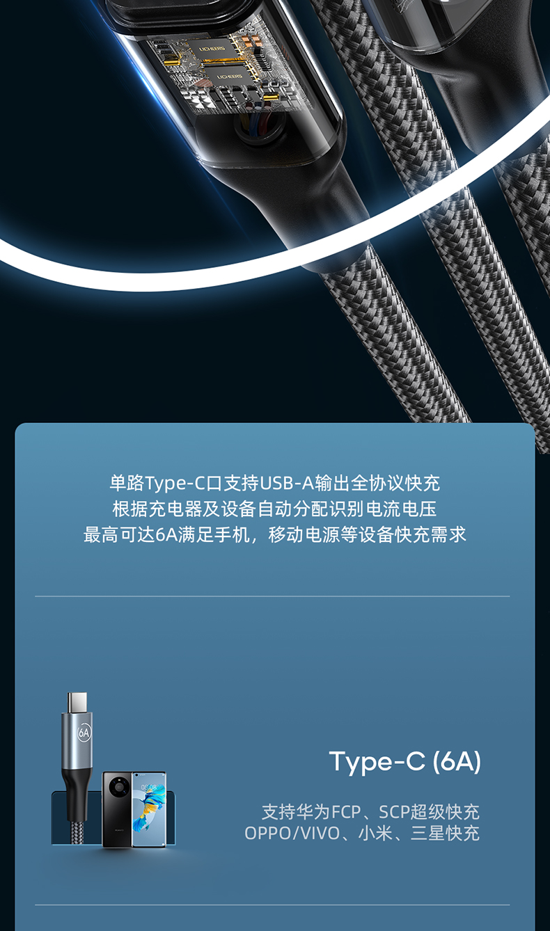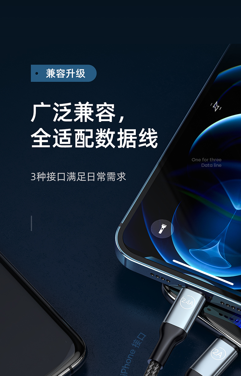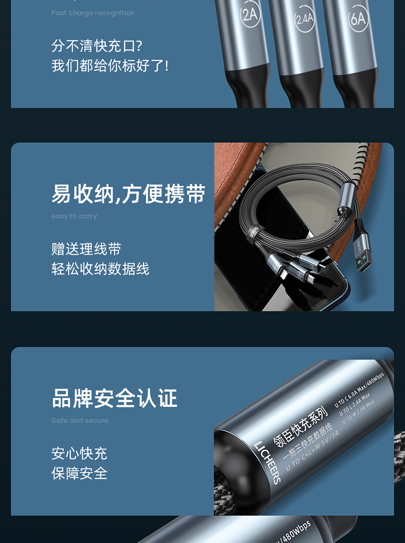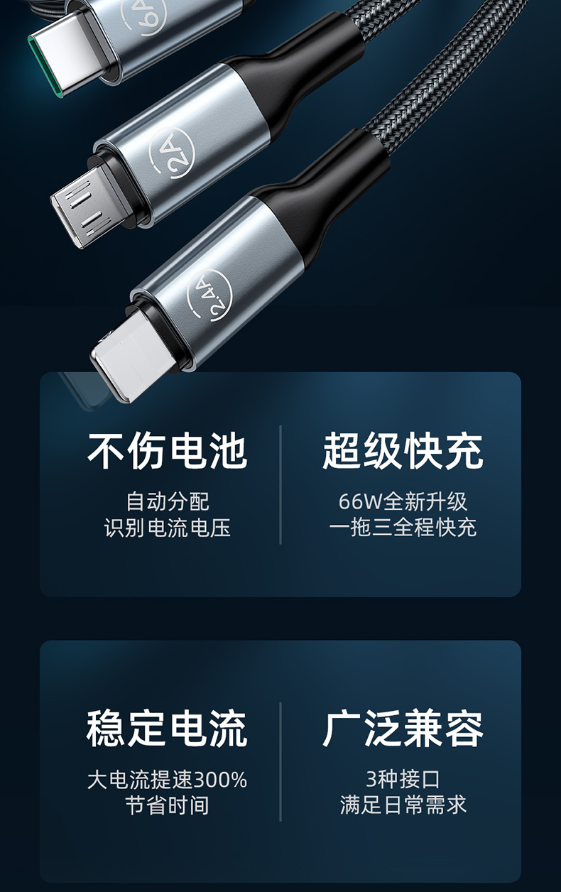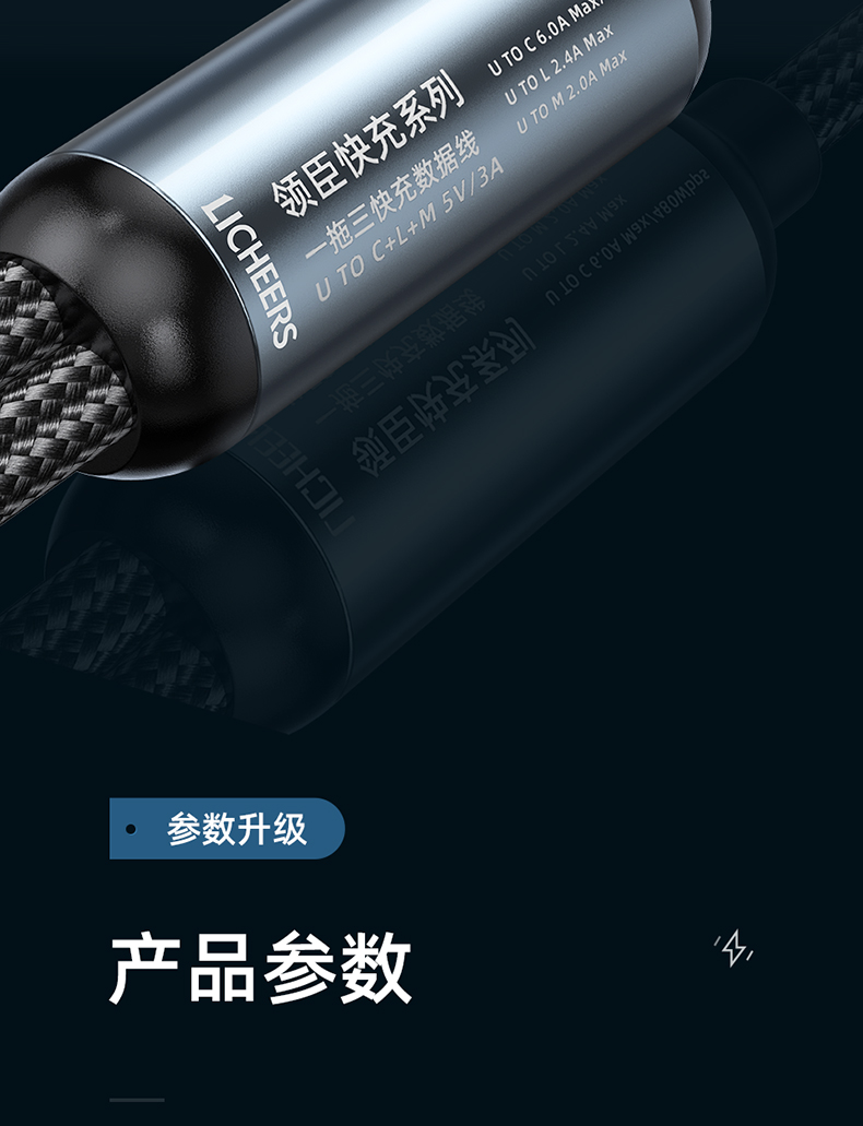 商品名称:LICHEERS/领臣1.8米66W一拖三铝合金快充数据线LC-439