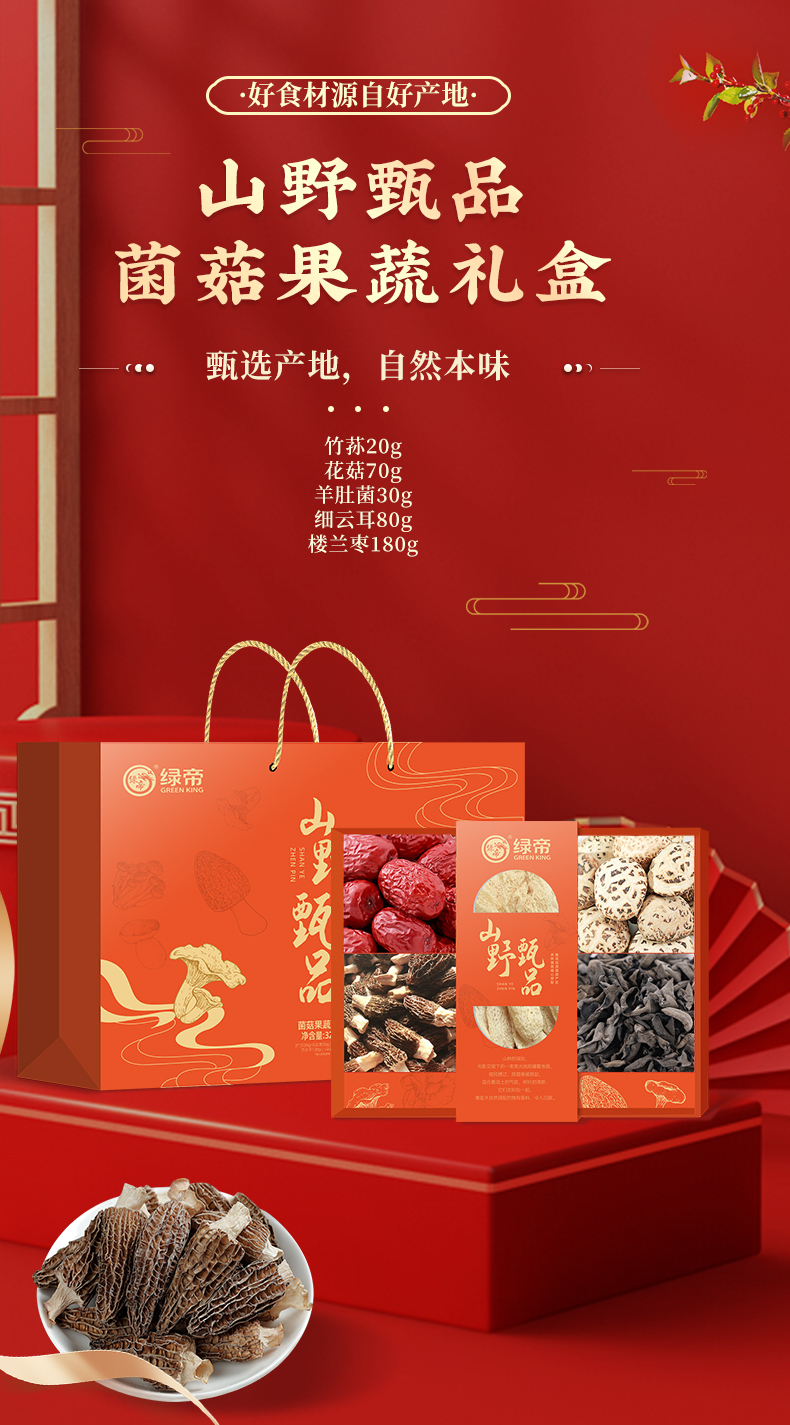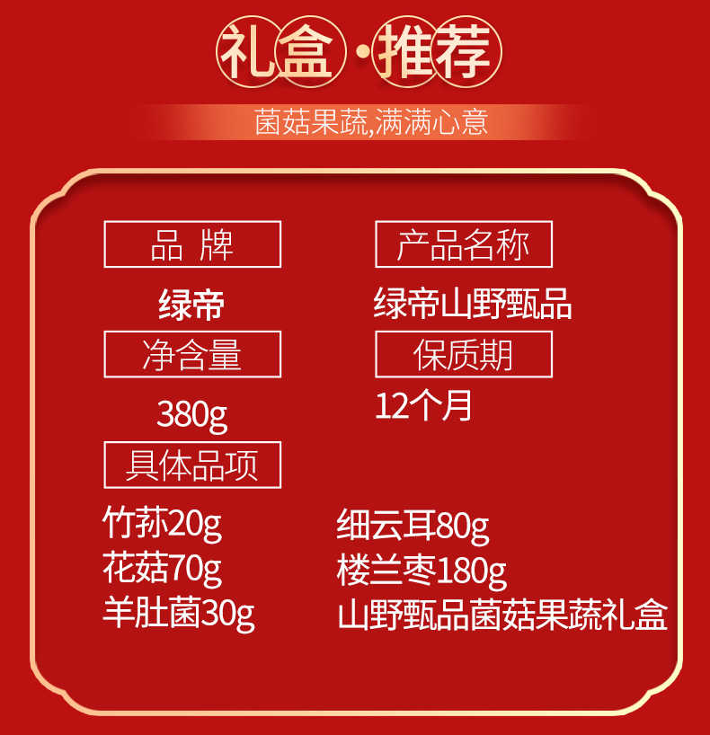 商品名称:GREEN KING/绿帝山野甄品菌菇果蔬干货礼盒380g