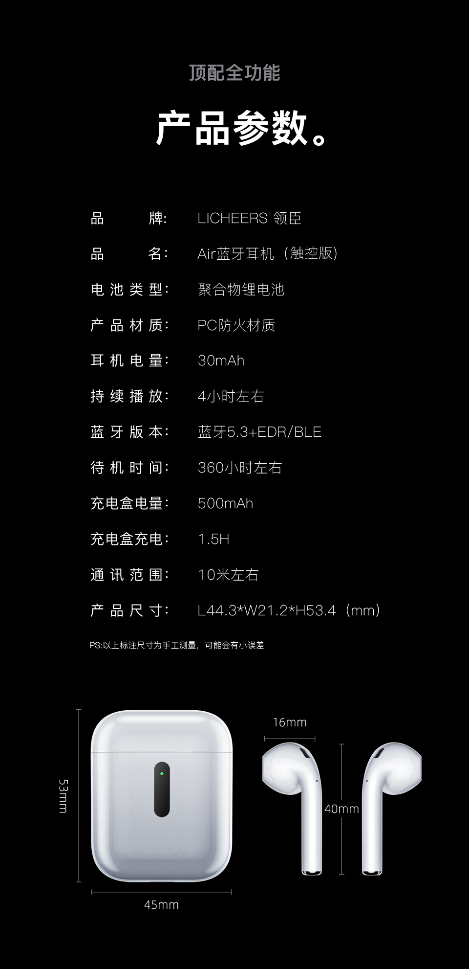 商品名称:LICHEERS/领臣入耳式第二代无线蓝牙耳机AirPlus2