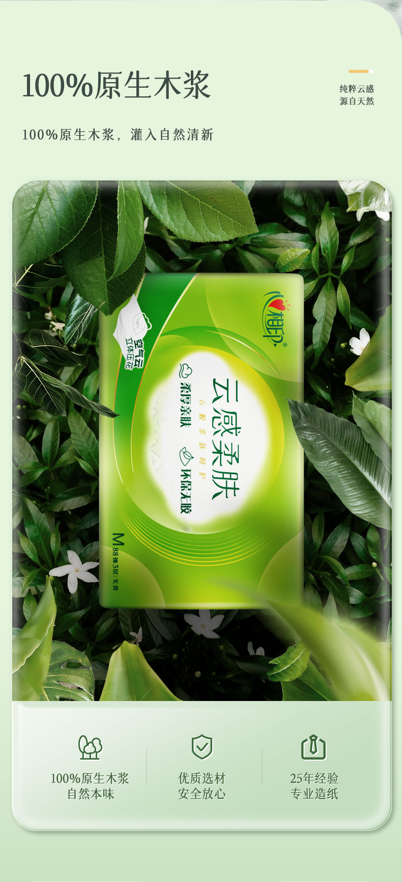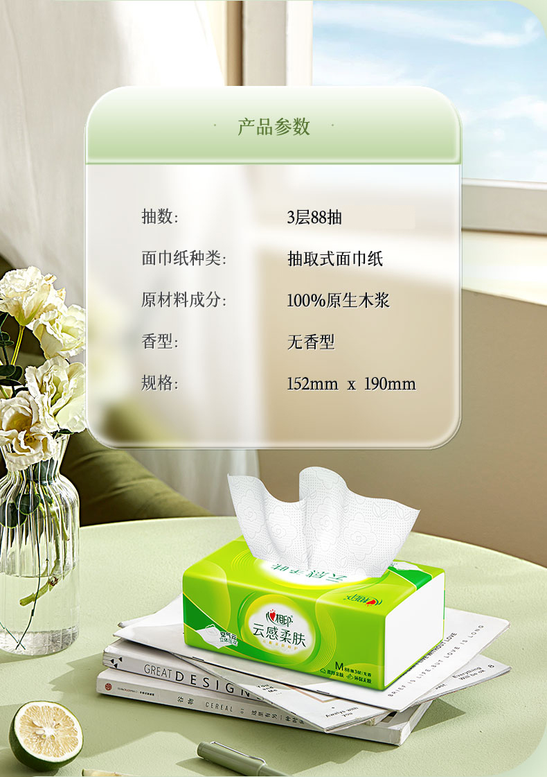 商品名称:心相印云感柔肤空气云立体压花无香型抽取式面巾纸M码3层88抽*8包