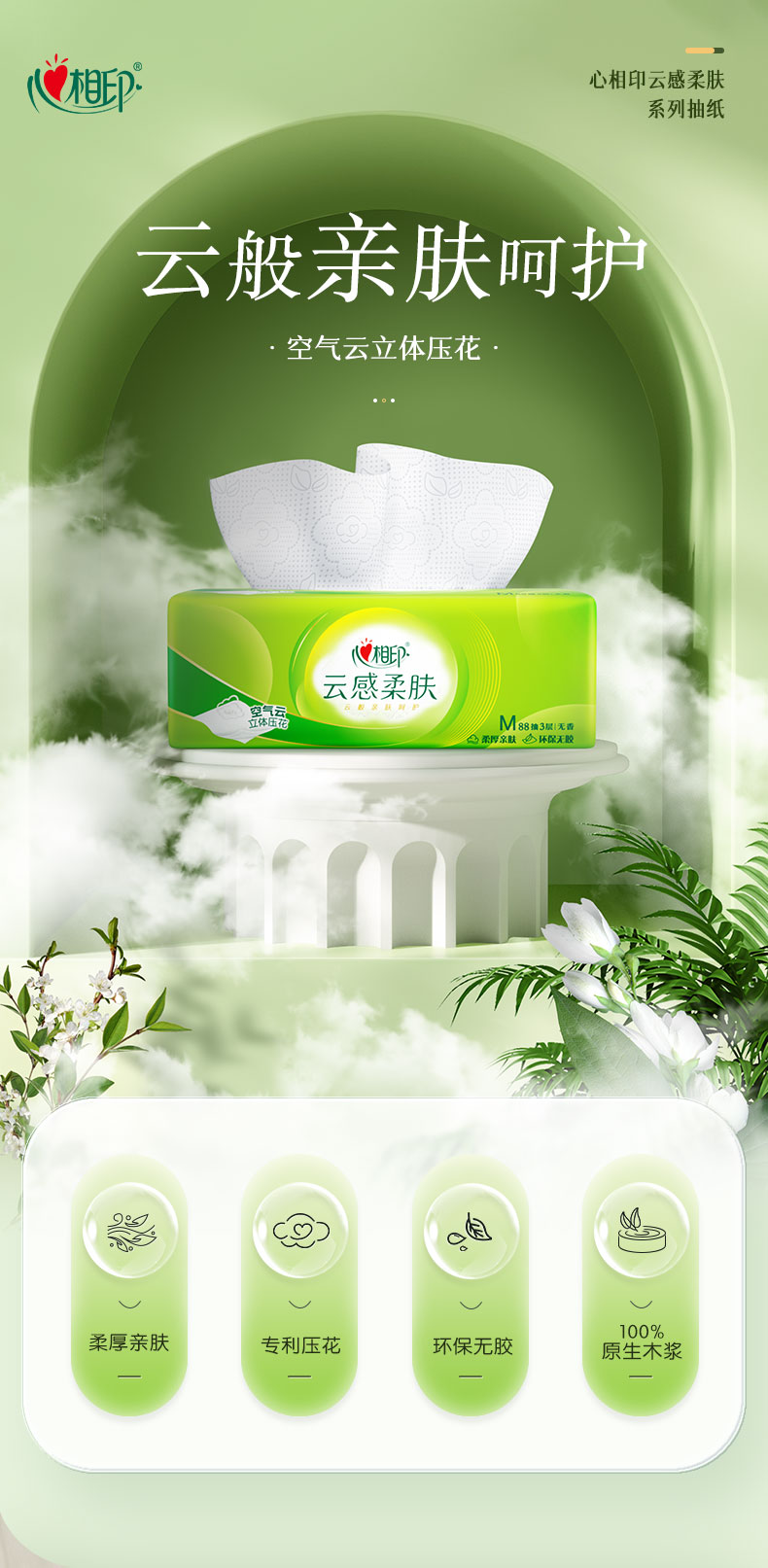 心相印云感柔肤空气云立体压花无香型抽取式面巾纸M码3层88抽*8包