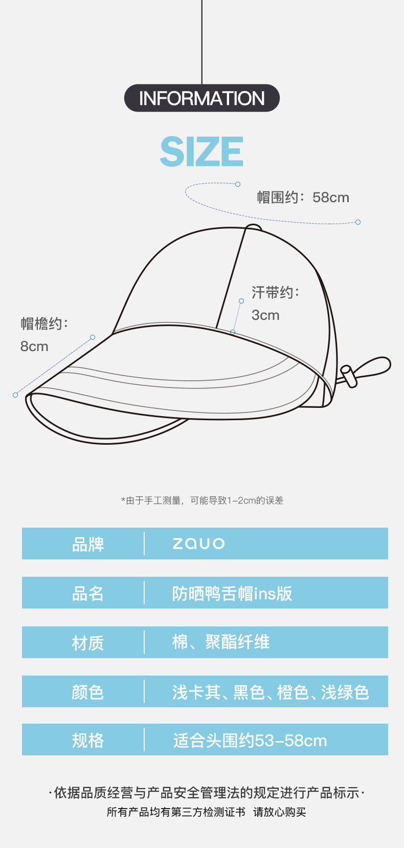 商品名称:zauo防晒鸭舌帽ins版