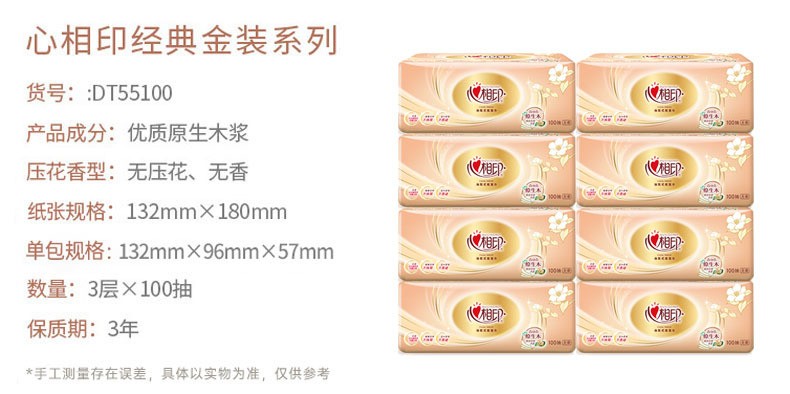 商品名称:心相印经典金装系列无香型抽取式纸面巾3层100抽*8包