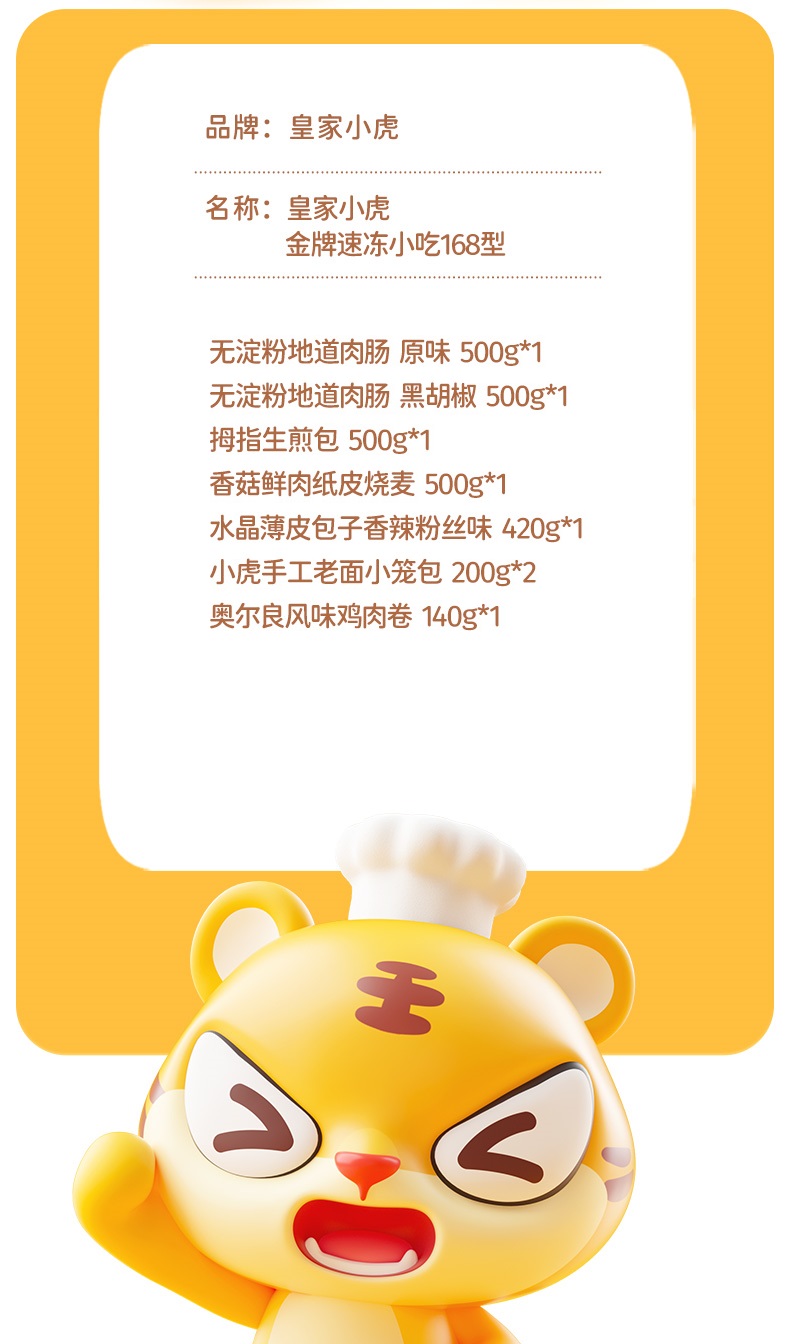商品名称:【顺丰配送】皇家小虎金牌系列速冻小吃168型2960g