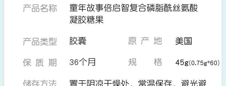 商品名称:加拿大 童年故事(Child Story)倍启智复合磷脂酰丝氨酸凝胶糖果45g(0.75g*60粒)