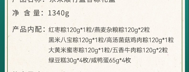 商品名称:东来顺 竹篮香粽礼盒 1340g (粽子8个+咸鸭蛋4个+糕点)