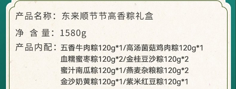 商品名称:东来顺 节节高香粽礼盒 1580g (粽子11个+咸鸭蛋4个)
