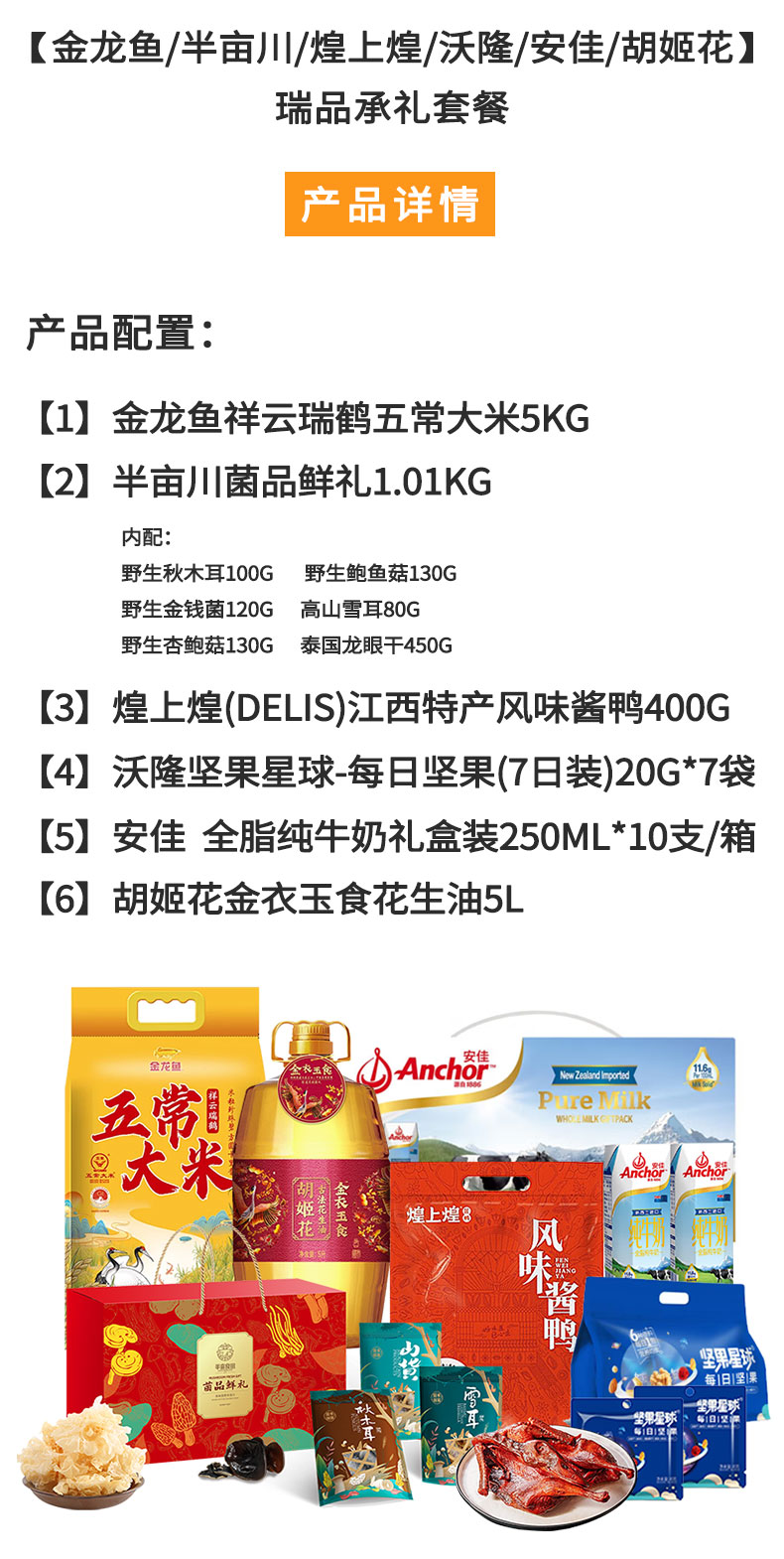 商品名称:金龙鱼/半亩川/煌上煌/沃隆/安佳/胡姬花 粮油牛奶卤味坚果山珍瑞品承礼组合6.55kg+7.5L
